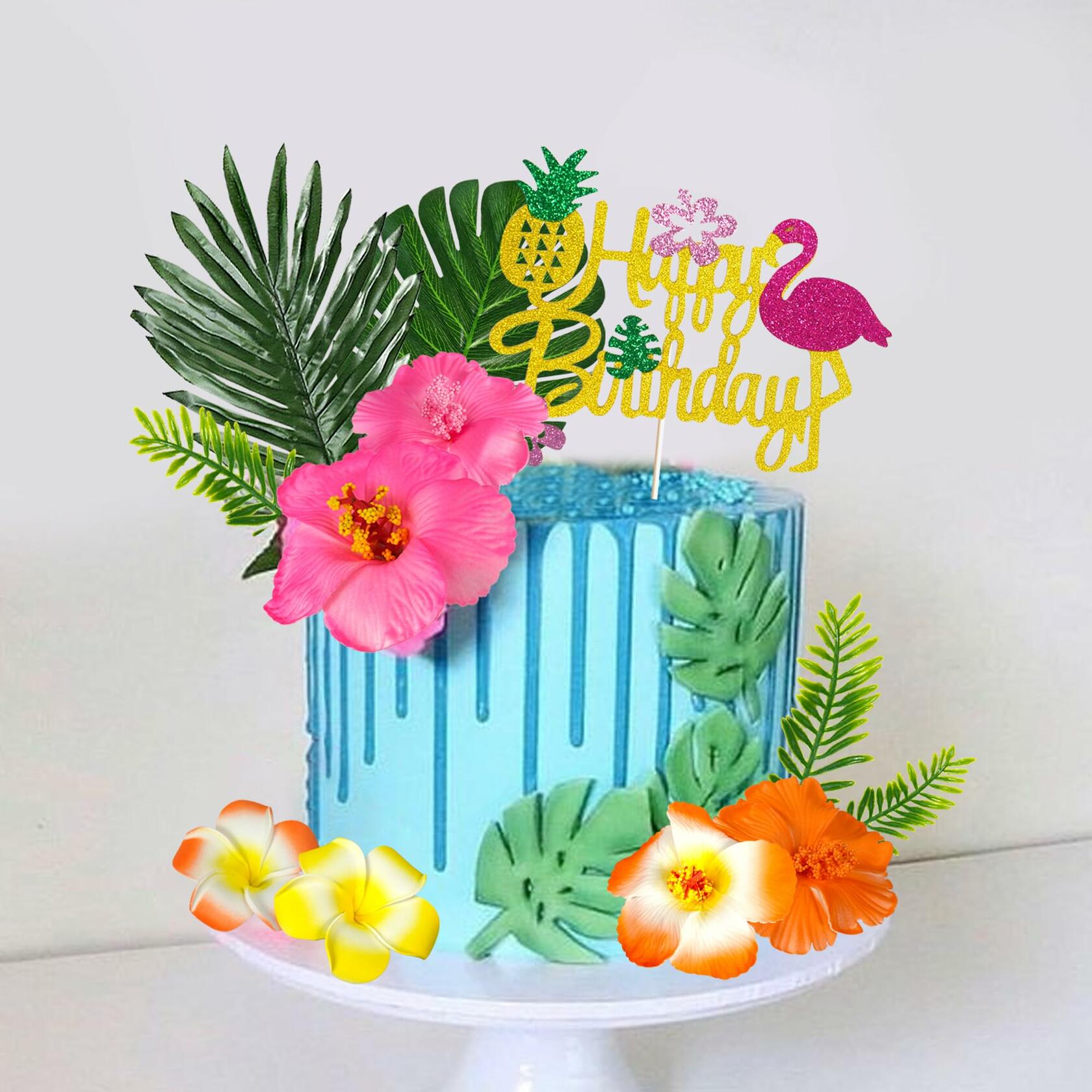 - Package Included: 4 x green leaves, 1 x happy birthday cake topper, 6 x flowers, 2 x palm leaves. The specific size is shown in the picture.