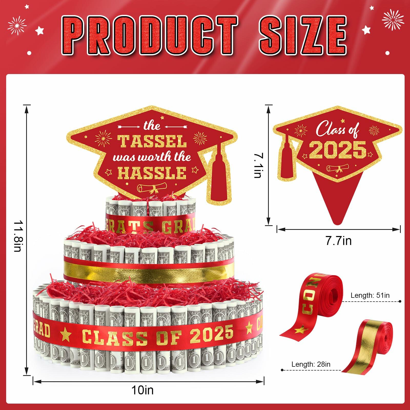- Graduation Money Cake Dimension: our red and gold class of 2025 graduation money cake measures 11.8inch height x10inch diameter after assembly.The graduation cake topper measure 7.1x7.7inch and one roll of ribbon is pure gold color measure 28inch,the other was printed a sign of “Congrats Grad Class of 2025” measure 51inch in length.