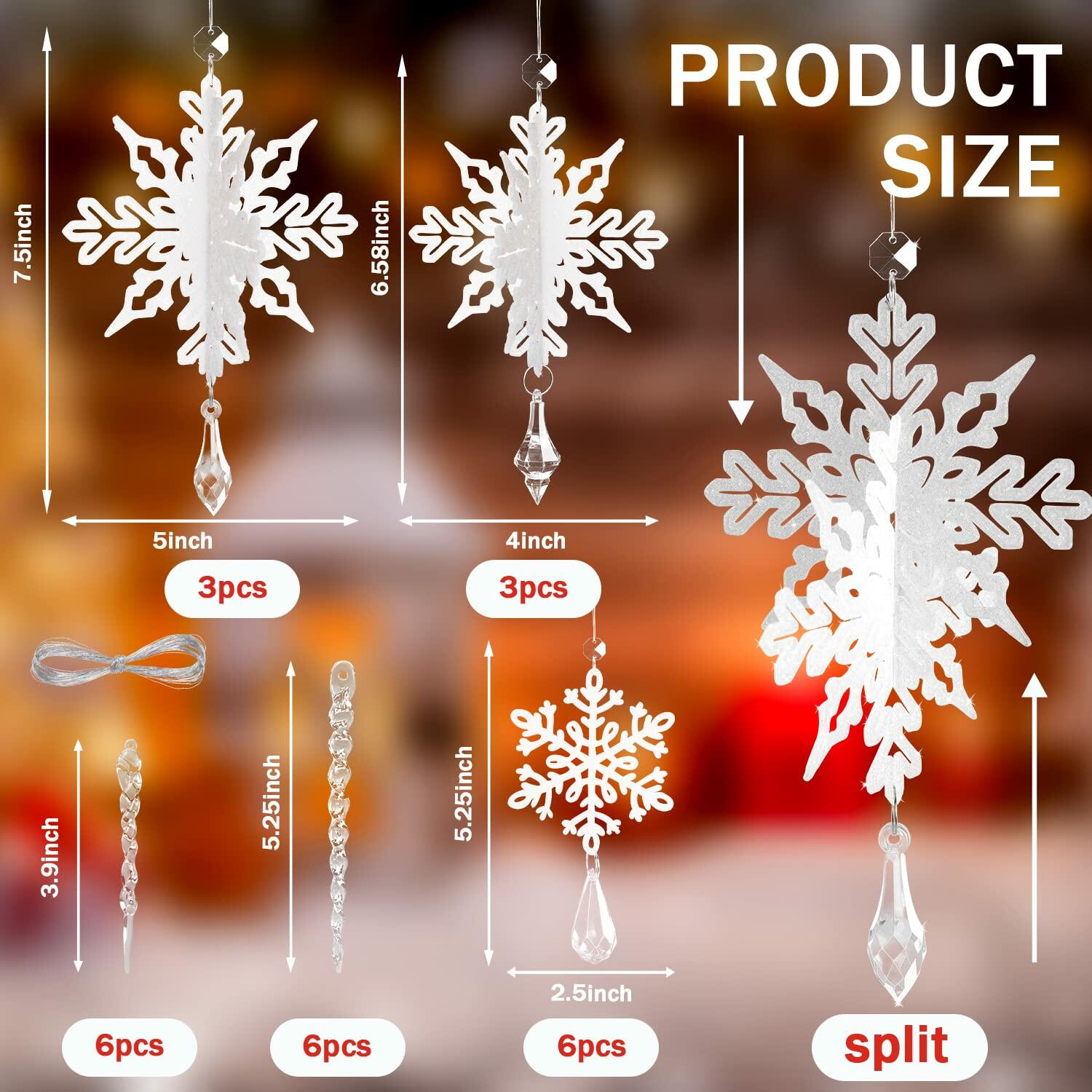- Great Value Pack: The Christmas Ornament Set includes 12 icicles and 12 three-dimensional snowflakes. There are 6pcs 3.9-inch icicles and 6pcs 5.25-inch icicles. 3pcs 7.5-inch snowflakes, 3pcs 6.58-inch snowflakes, and 6pcs 2.5-inch snowflakes. Snowflake ice cream decorations in different sizes can meet your different decorative needs and add a touch of color to your Christmas tree.