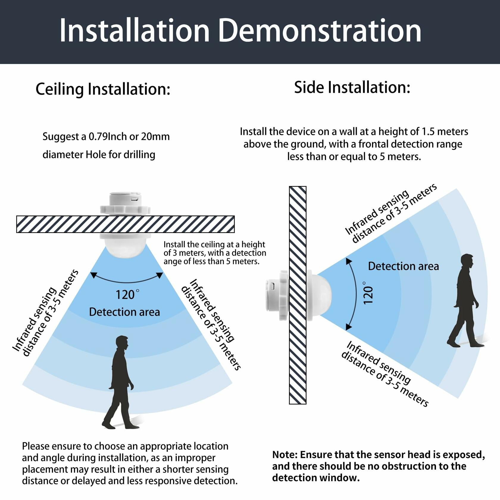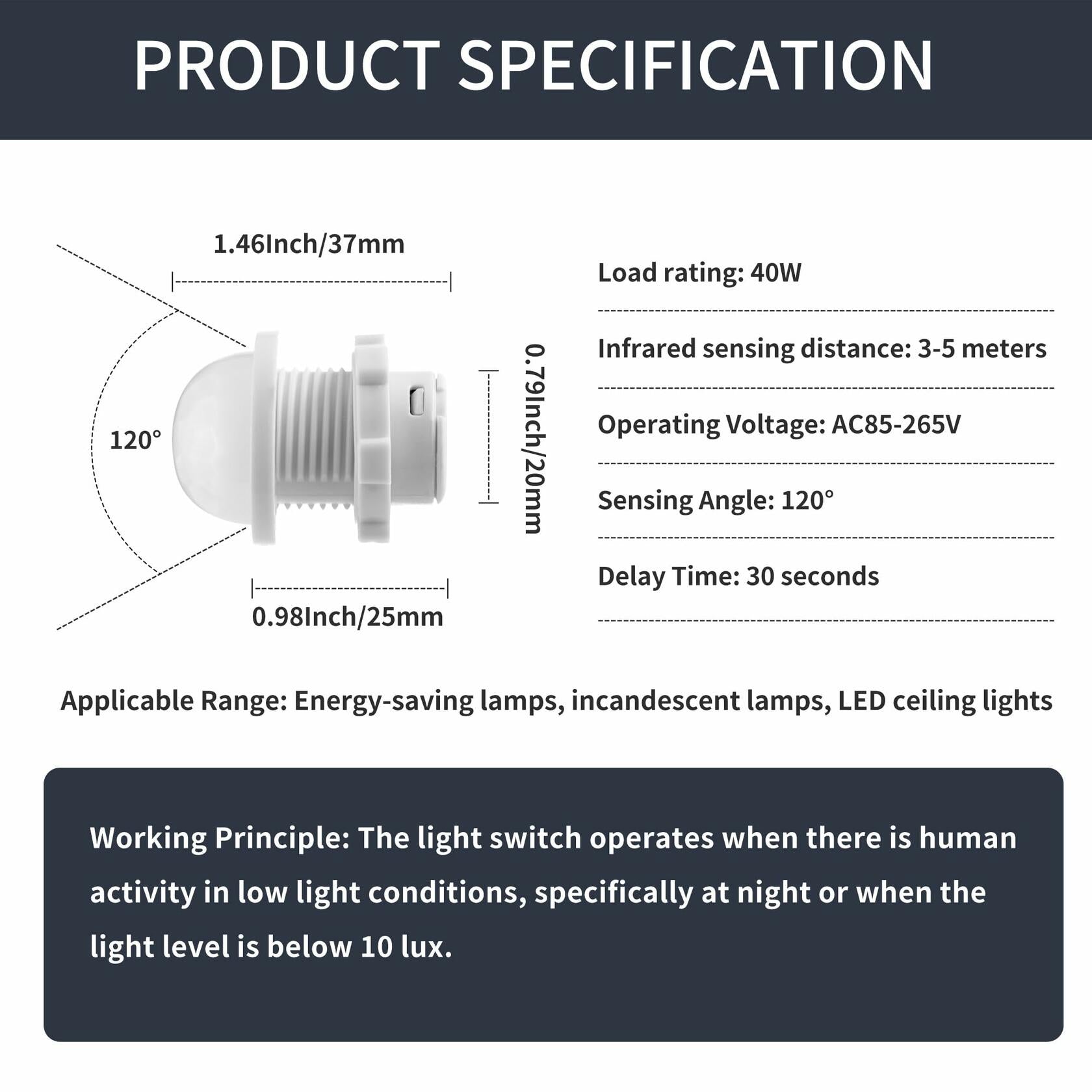 SPECIFICATIONS: Item: Motion Sensor Light Switch Color: white Working voltage: AC85V-265V Load power: <=40W Working temp: -20 ℃ -+40 ℃ Static current: < 50μA Time delay: 30 seconds Output mode: sensor output Induction angle: 120 ° cone shape Induction distance: 3M-5M (9.84FT-16.4FT) Hole opening diameter: 20mm / 0.78inch. Fits ceiling lights, Energy saving lamp etc.
