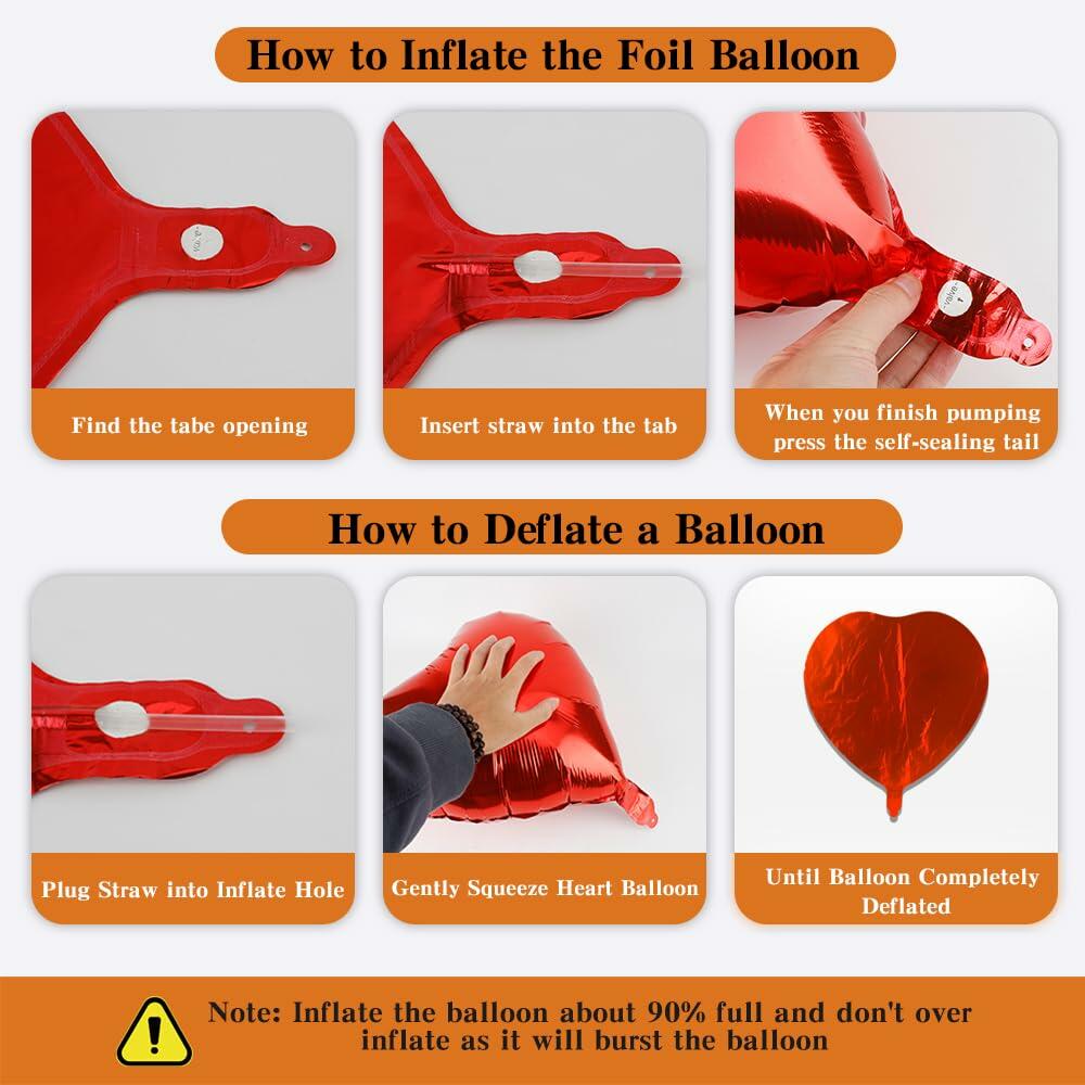 - Easy To Use & Decorate: The aluminum foil heart balloon supports helium or air pump inflation. Insert the valve of the balloon to inflate the balloon. The heart shaped balloon is self sealing, just press the valve to seal the balloon after inflation. Note: Over-inflation will deform the balloon and cause it to burst, just inflate it to 90%