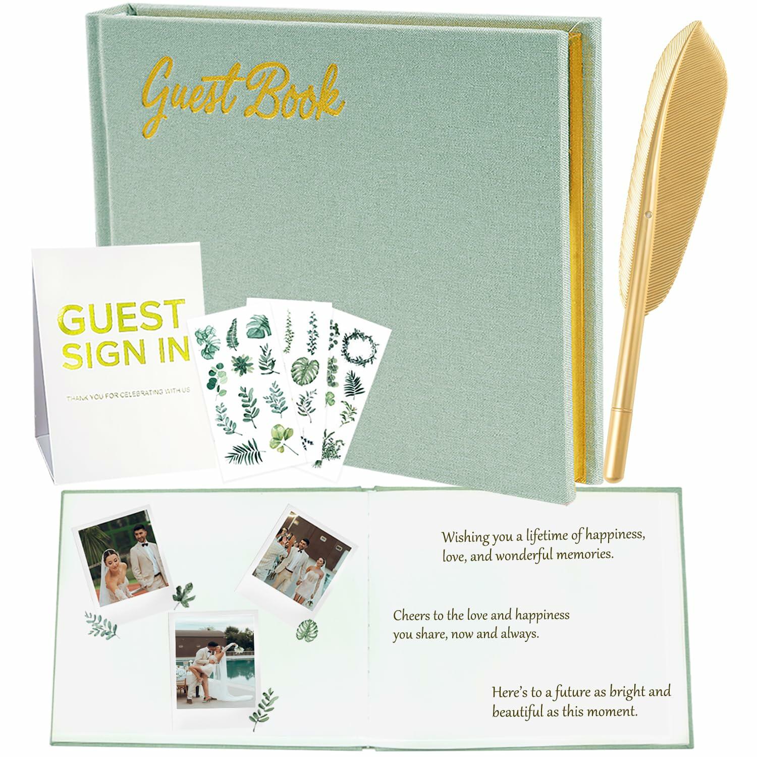 - Elegant Linen Cover Design - Guest Book crafted with a durable 9x7” linen cover classic green and delicate hot stamping process gold print, providing a luxurious metallic sheen, presenting a fresh and elegant look. It comes with 1 'sign in' card, 1 feather pen and 3 floral photo stickers. The cover and spine edges are both decorated with delicate gold - printed fonts, adding a touch of luxury and refinement to the whole design