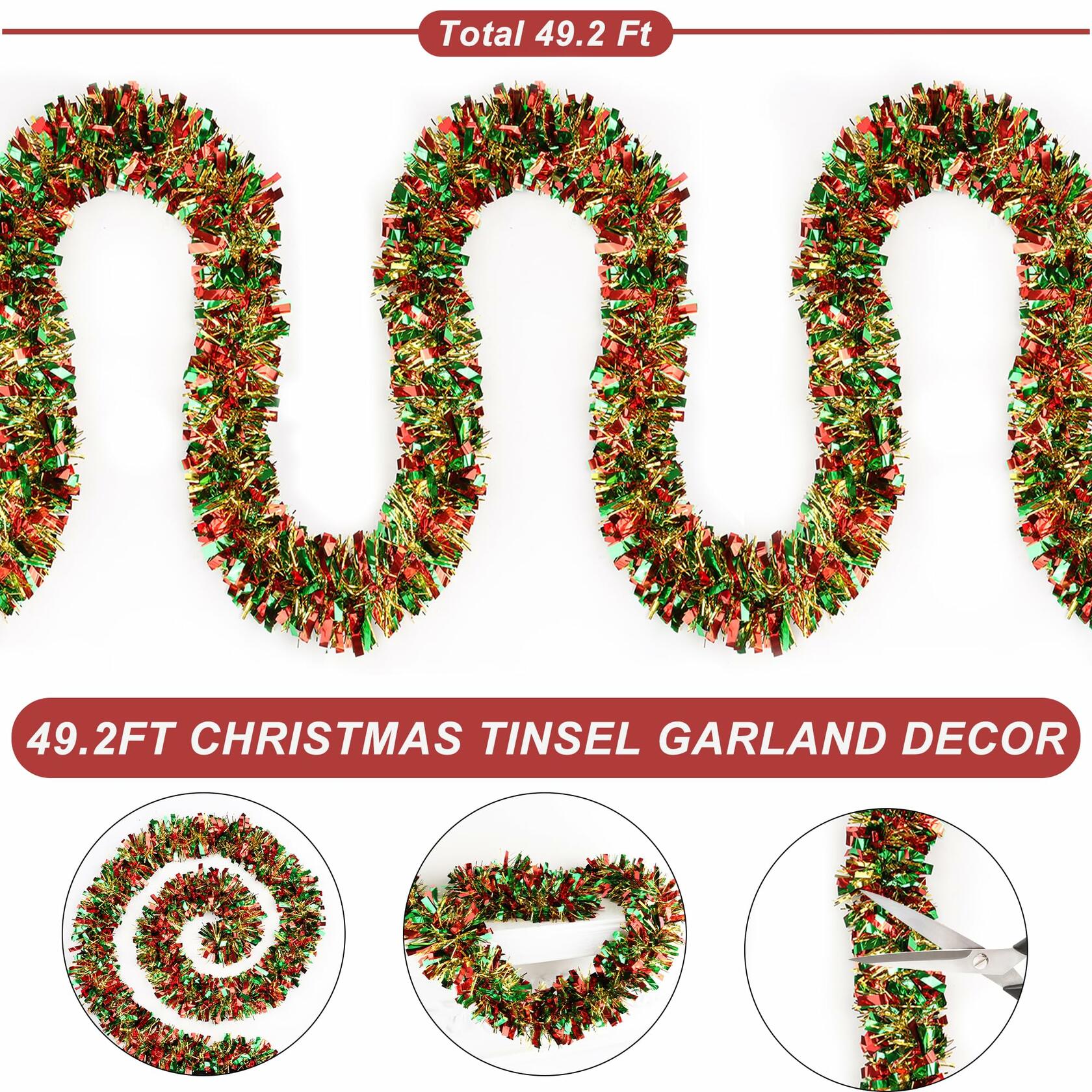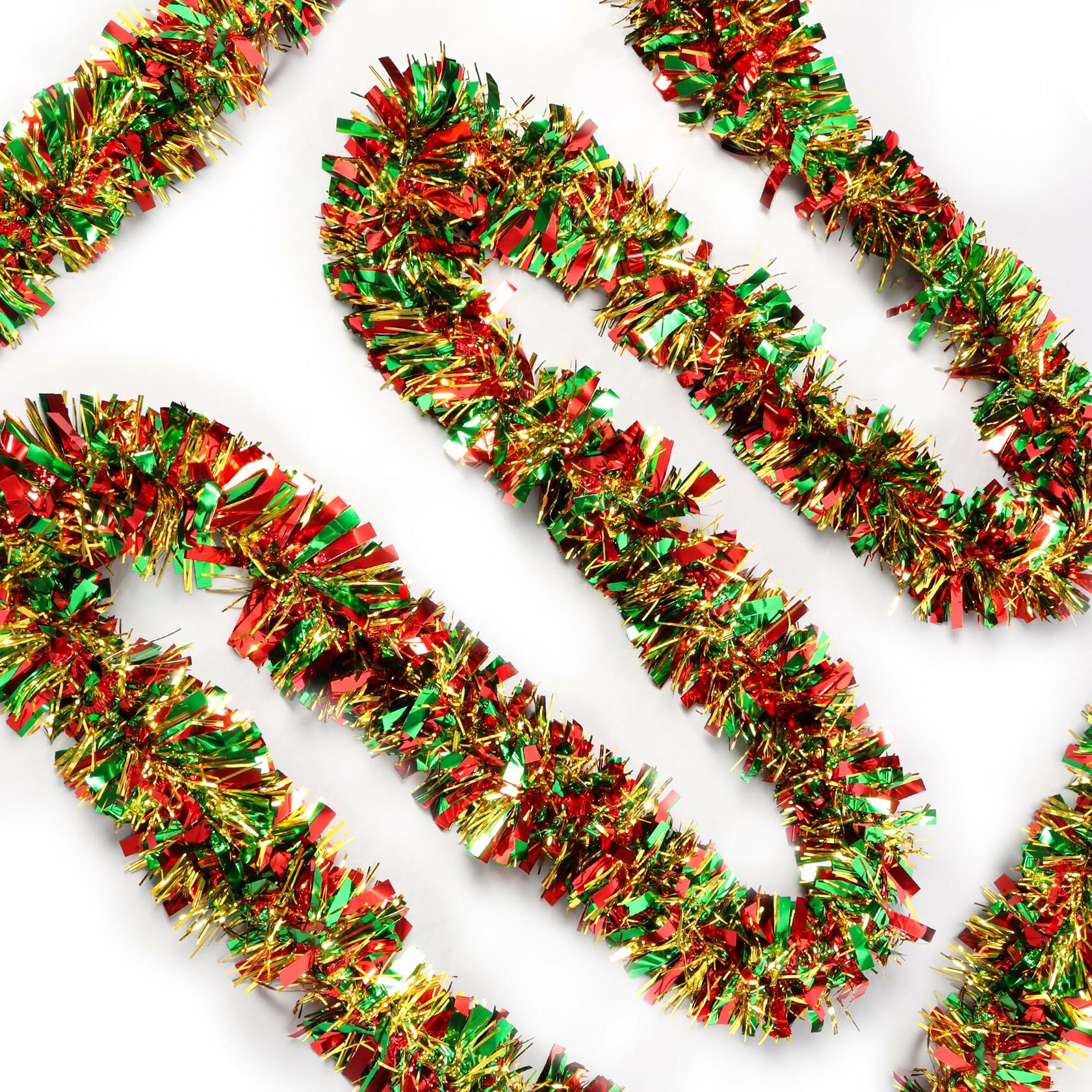 - [ Unique Thick Tinsel Design ]: This garland features wide, metallic tinsel that shimmers beautifully in the light. Designed in classic Christmas colors, it’s packed with sparkle to enhance your holiday atmosphere.