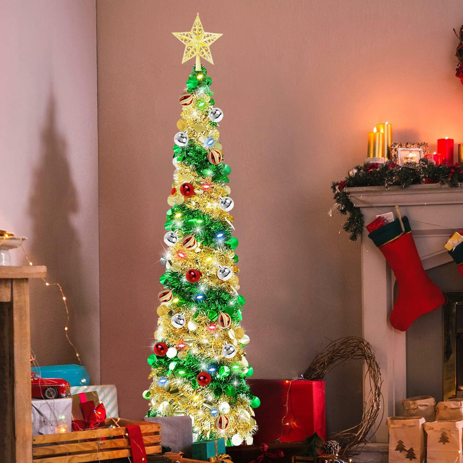 5ft Pop Up Christmas Tinsel Tree w/ Lights Ornaments Collapsible Pencil