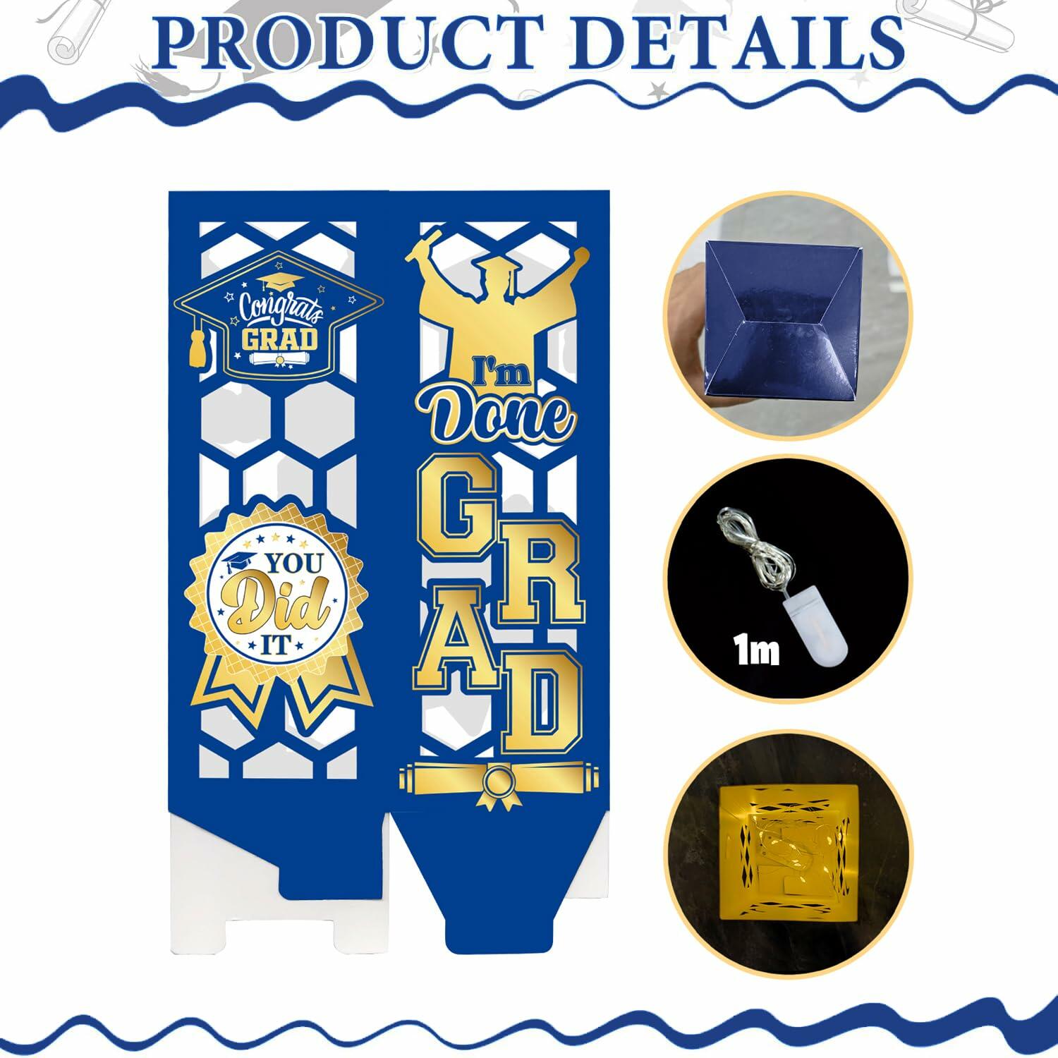 - You Will Get: Package includes 6 graduation lantern boxes (2 patterns, 3 each) with blue as the main color, suitable for dance parties, graduation ceremonies, creating a strong festive atmosphere. Each decoration box offers a fun surprise touch to your graduation ceremony.