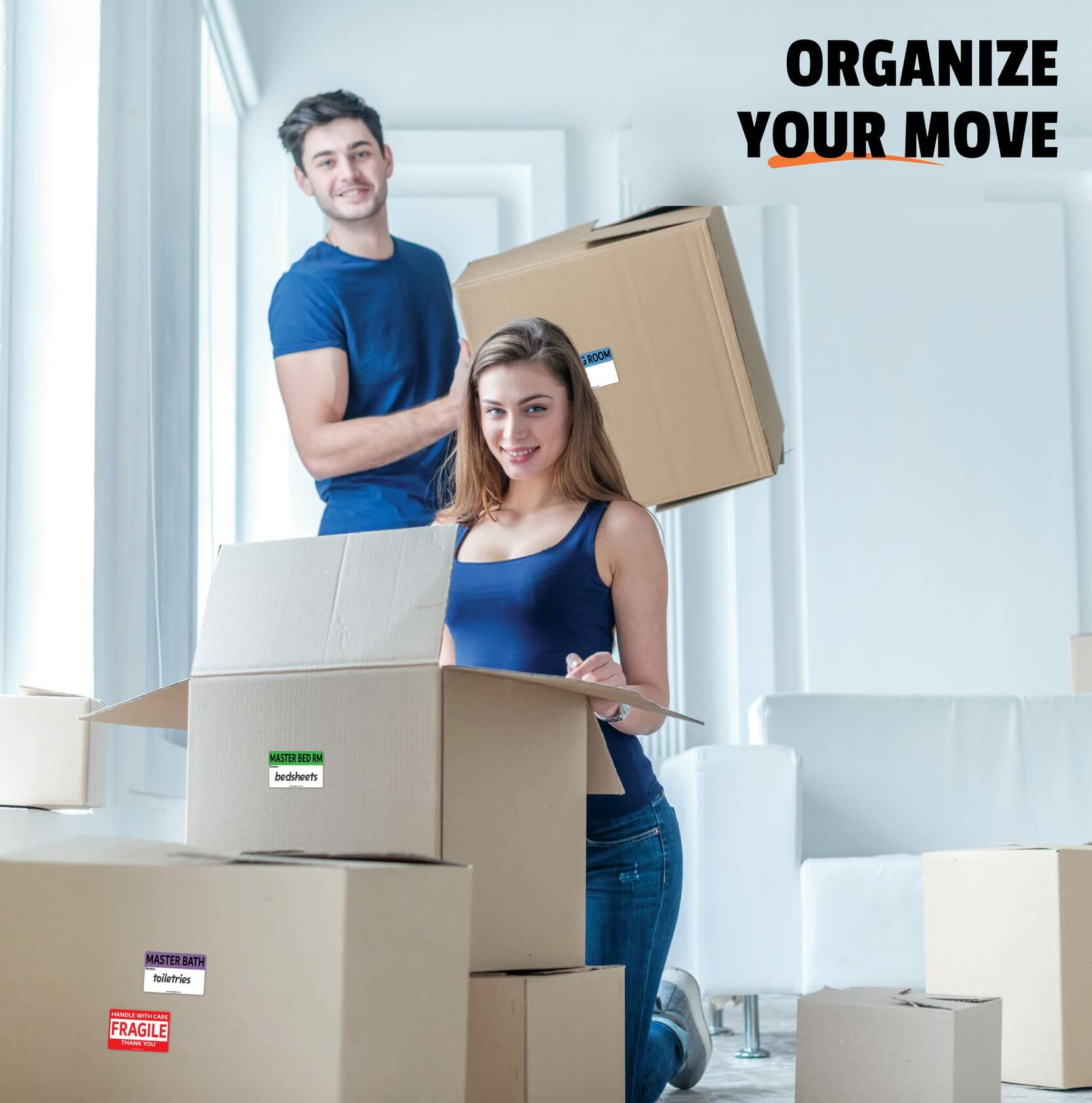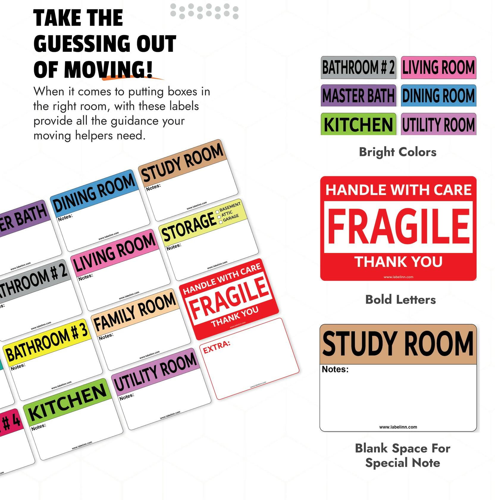 Efficient Moving Labels Color Coded: These fade-resistant, high-light stickers are designed specifically for moving boxes. These moving stickers for boxes are adhered to permanently to keep them looking their best during relocation. Small but easily overlooked, these labels moving allows the home mover to unload to the correct room in seconds.