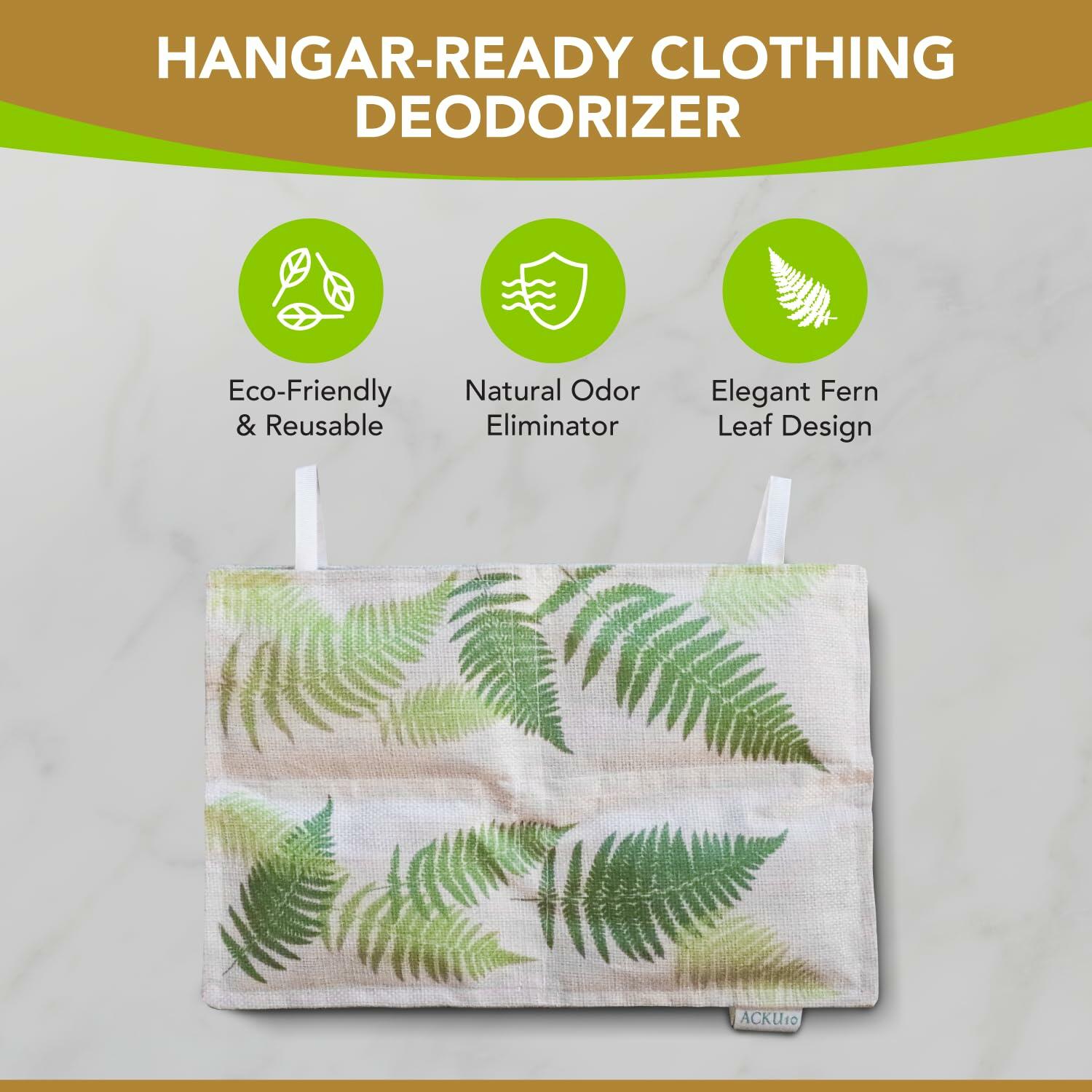 Tired of that persistent musty smell greeting you every time you open your closet? ACKU10 Bamboo Charcoal Deodorizer Vest for Hangers is a revolutionary natural odor eliminator for clothes that transforms the way you care for your wardrobe. Our innovative odor absorbing vest hangs with your clothing by draping over your clothes hangers. Crafted from premium-grade activated bamboo charcoal, it's 10x more porous than ordinary options, actively eliminating odors rather than masking them. Our unique wardrobe odor eliminator tackles everything from tobacco smells, food odors mustiness, while the elegant fern leaf pattern adds sophisticated style to your closet. The activated charcoal odor absorber works silently to maintain freshness without harsh chemicals. Perfect as a freshener and odor neutralizer, it protects your favorite clothes while eliminating the need for frequent dry cleaning. Before use, put in the sun to activate the charcoal and then add to your hangers to sustainably deodorize clothing, making it both environmentally conscious and economical. Closets, clothing bags and storage bins Gym lockers and sports bags Travel luggage and suit carriers Wet suit storage Seasonal clothing storage