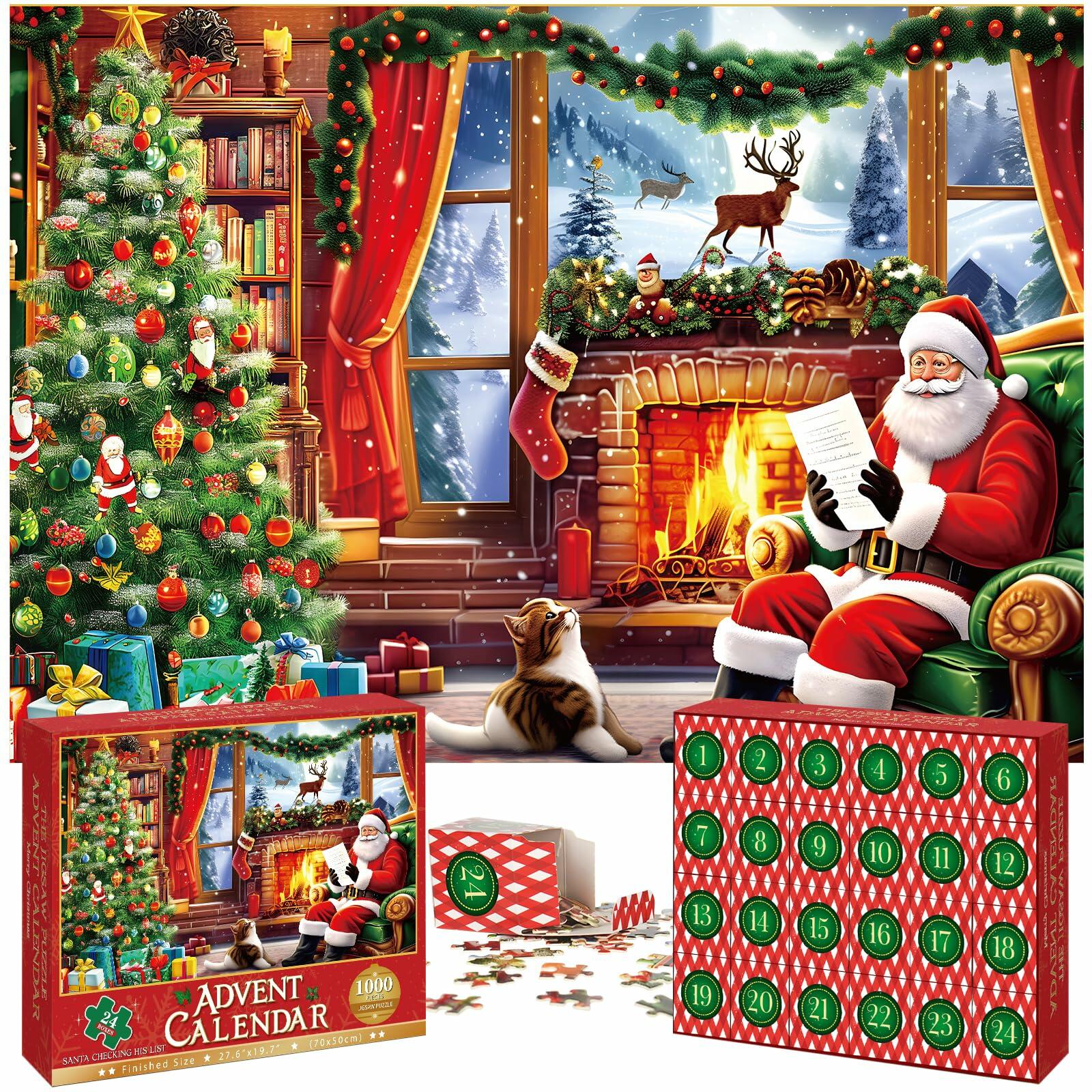 - 2024 Advent Calendar Puzzle: This 1000-piece jigsaw puzzle depicts a cosy holiday scene with Santa Claus checking his list by the fireplace in a rustic log cabin. The finished size is 19.7 inches x 27.6 inch (70 x 50 cm).