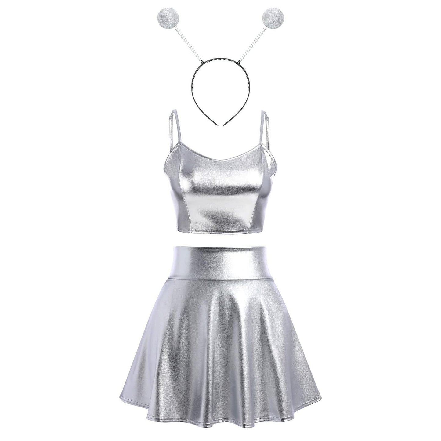 - Alien Costume for Women: Novelty metallic rave clothes for women leather crop top holographic top reflective top with metallic holographic skirt latex dress alien headband for women rave outfit 90s themed party outfits alien costume women inspired 70s 80s 90s vintage clothing statement sparkly rave holographic PU mermaid top, disco dance rave skirts shiny reflective rave outfit for women dance party dress up Halloween costume. Alien antenna headband for women, metallic silver tops for womens;