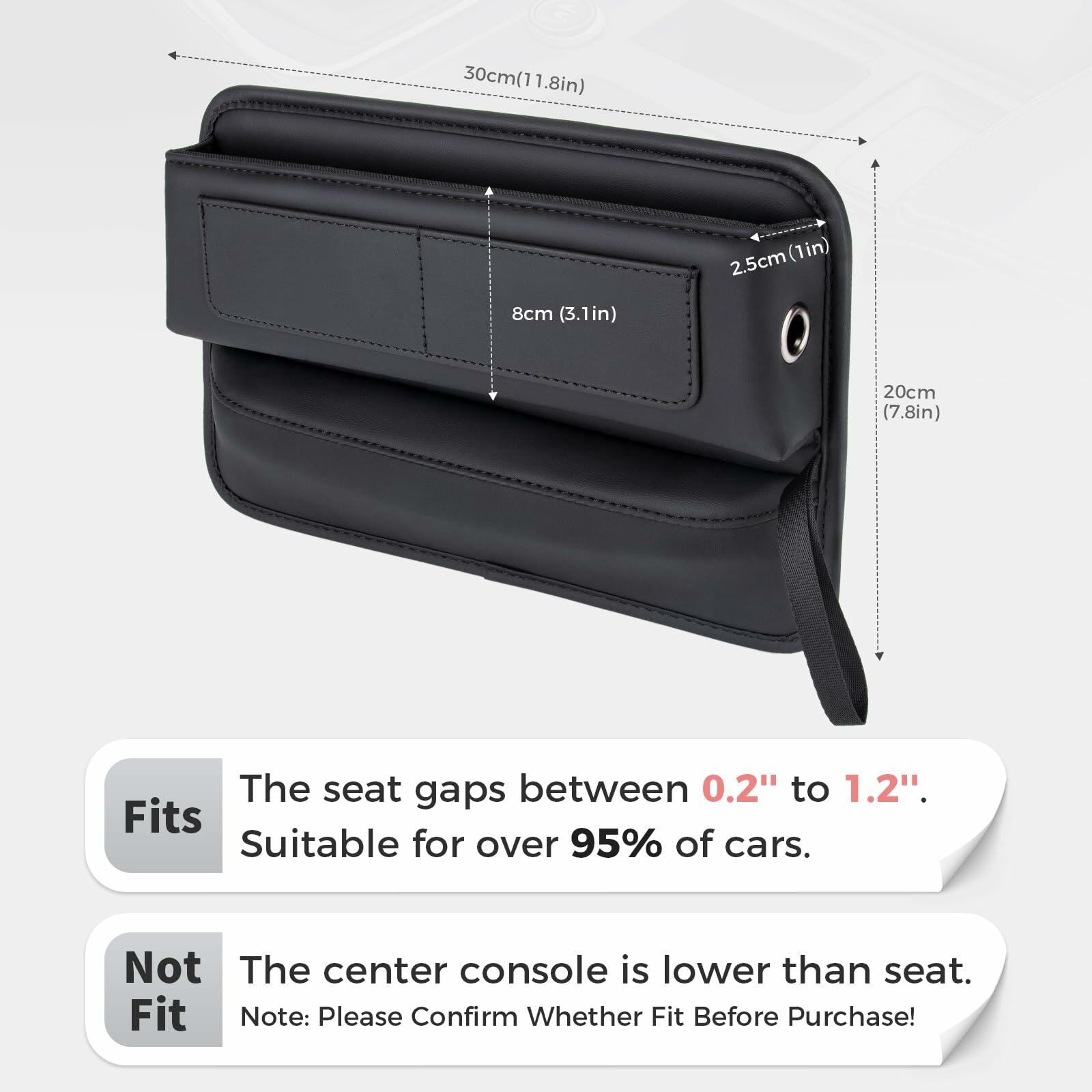 - Scope of Use: This universal front seat organizer will fit any seat seam between 0.2'' and 1.18''. Ideal for cars with a high center console, once tucked into the seam it sits under the armrest and fits snugly into the center console of the vehicle. Please note that this product is not available for all cars