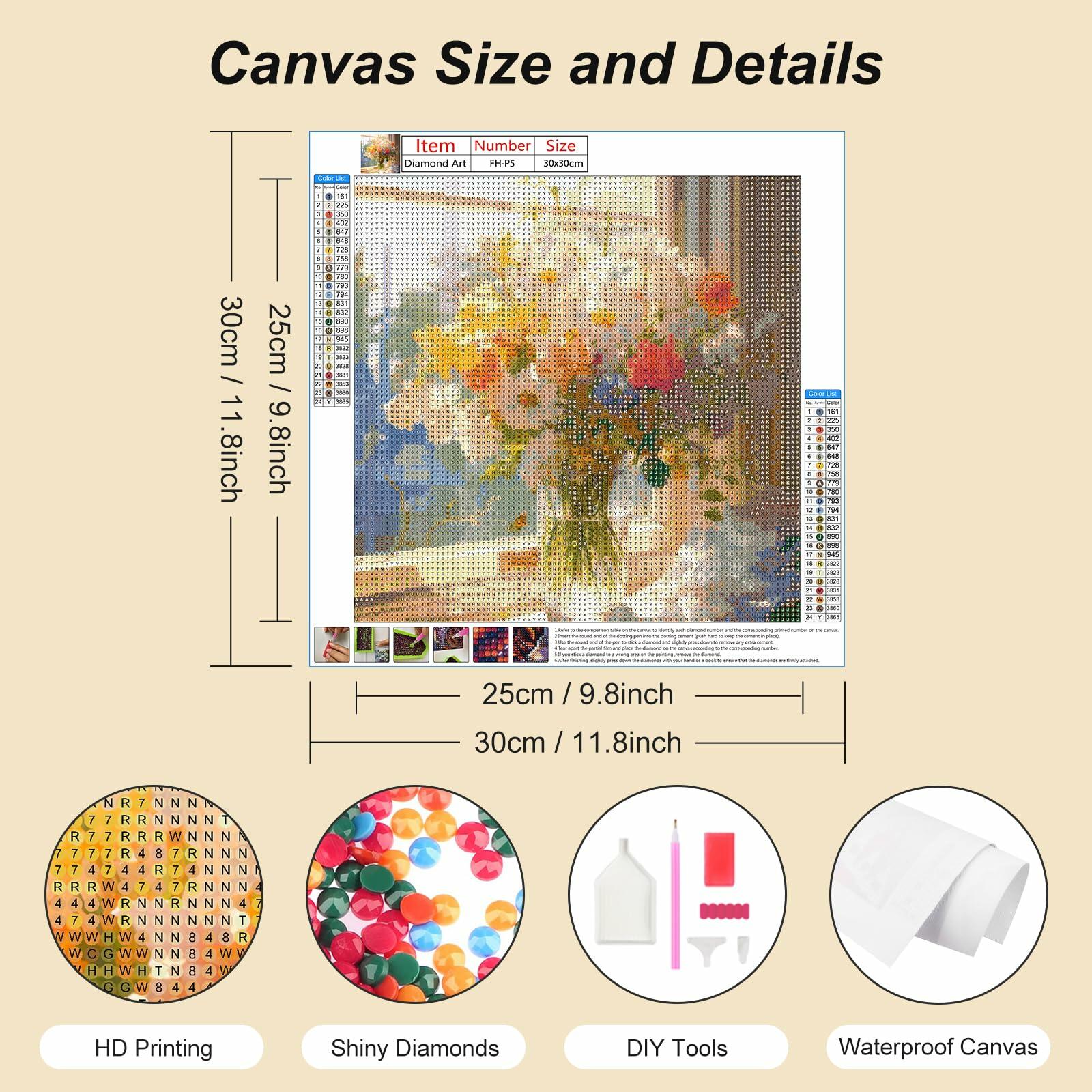 - 【Diamond Painting Size And Packaging】The diamond painting size is 30x30cm, including 1* high-definition canvas, 1* dot diamond pen, 1* cubic diamond tray, 1* red glue block, 1* pen cap. This set contains enough colorful round small diamonds and all the tools you need to make a diamond painting