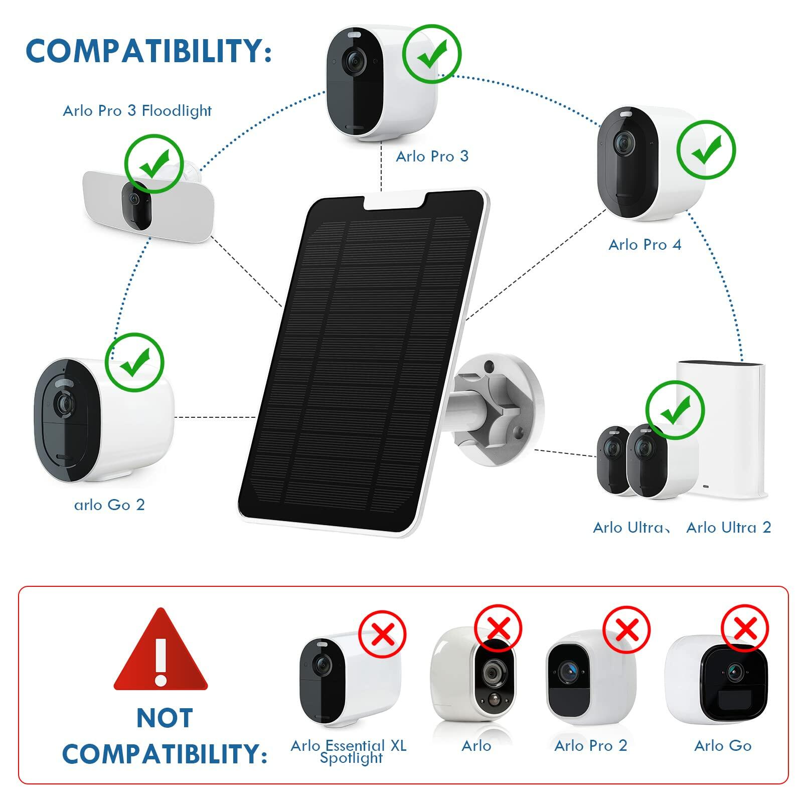 - Charge your Device: 4W Solar panel Compatible with Arlo Pro 3/Arlo Pro4/Arlo Ultra/Arlo Ultra 2/Arlo Pro 3 Floodlight, a few hours of direct sunlight every day would keep your Arlo Camera charged around the clock; No more battery.