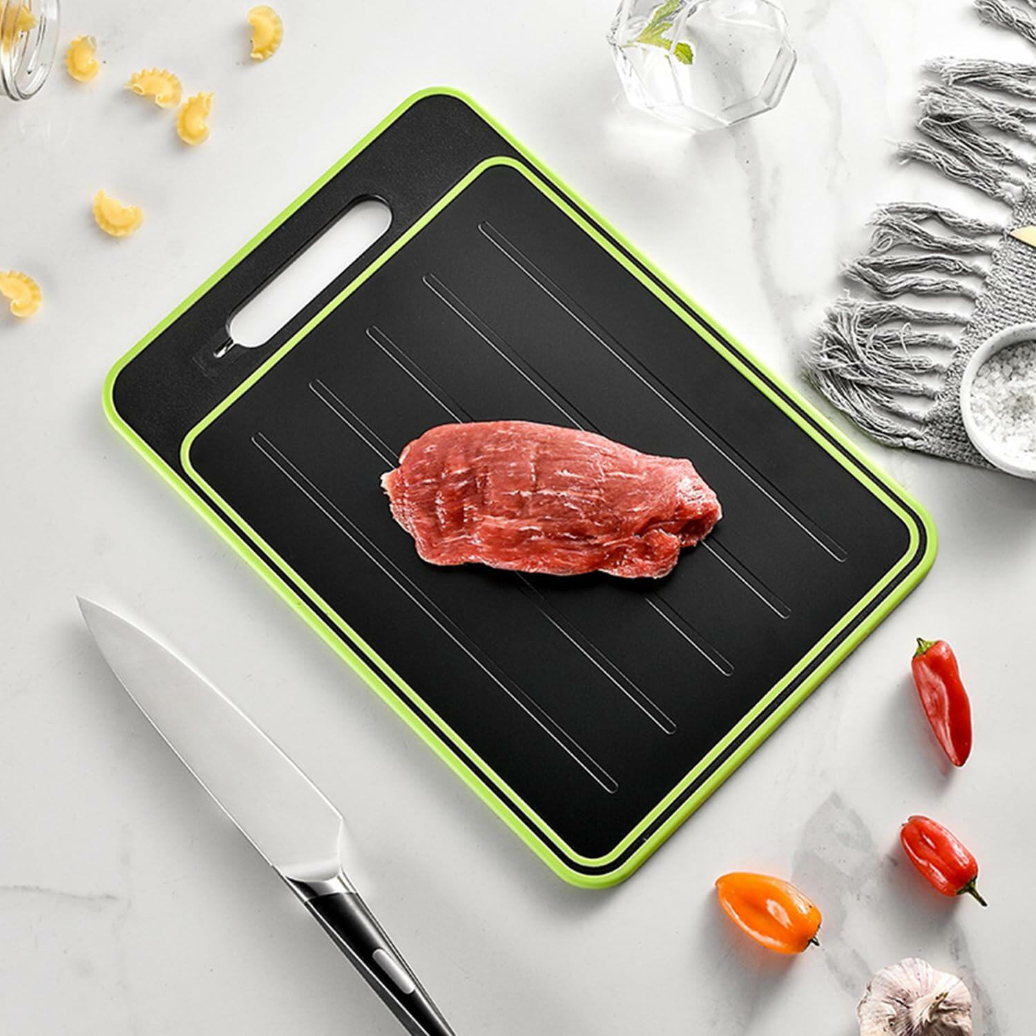 - 2/1 Dual Sided Cutting Board: This cutting board is a universal 2/1 kitchen tool, one side is made of food grade 304 stainless steel to cut raw meat, and the other side is made of wheatgrass PP material to cut vegetables and fruits,