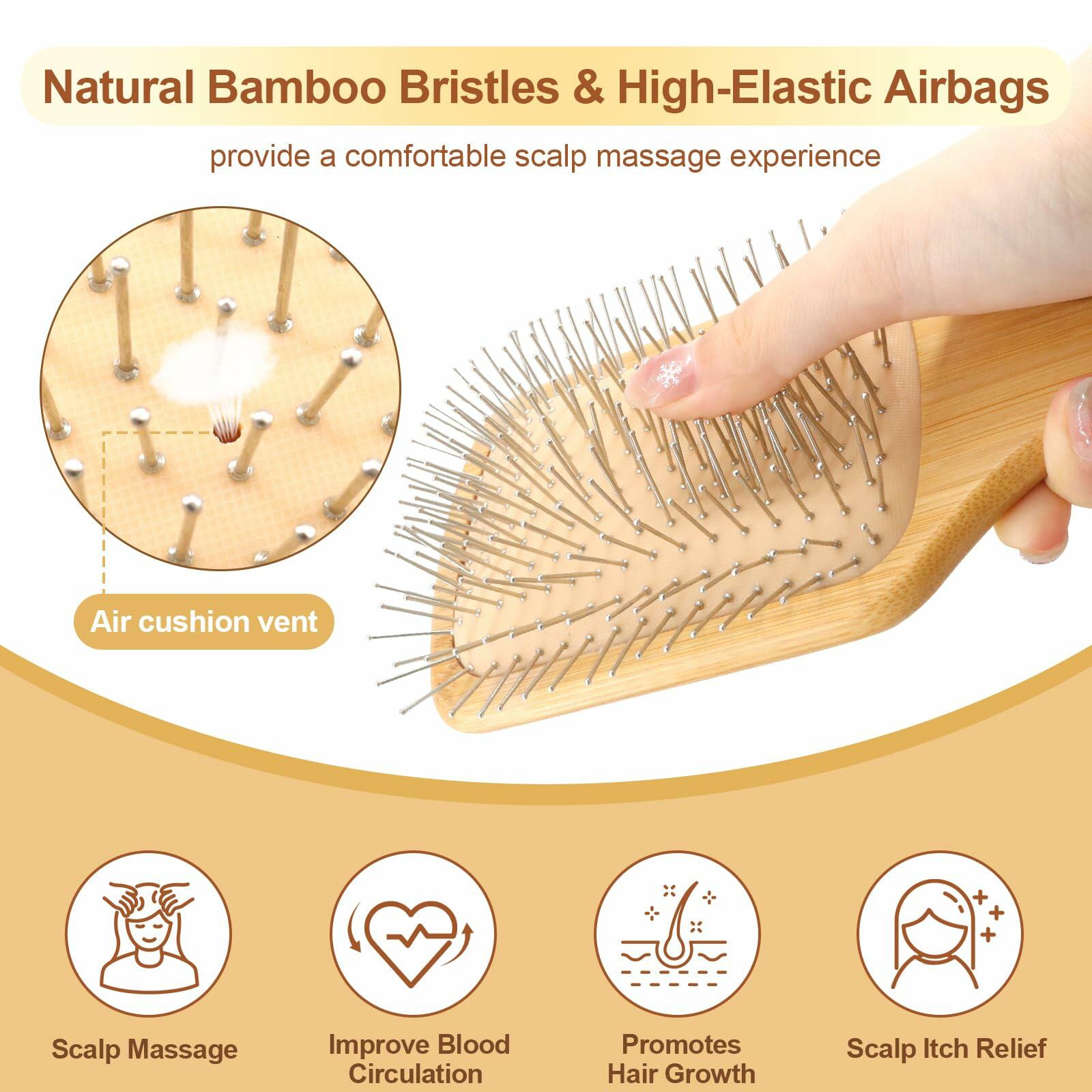 The natural bamboo hair comb has metal teeth and can be used by men, women, young and old. It is suitable for long hair, short hair and curly hair. There is an air bag on the hair comb, which can effectively improve the blood circulation of the scalp, has a massage effect, and can effectively deal with tangled hair. It will not generate static electricity when used. The size error can be within 0.1 inches. It adopts ergonomic design and feels comfortable to hold. After use, your hair will become soft and silky. Usage suggestions 1. Do not soak in water for a long time 2. Clean the hair comb in time to avoid affecting the use experience."