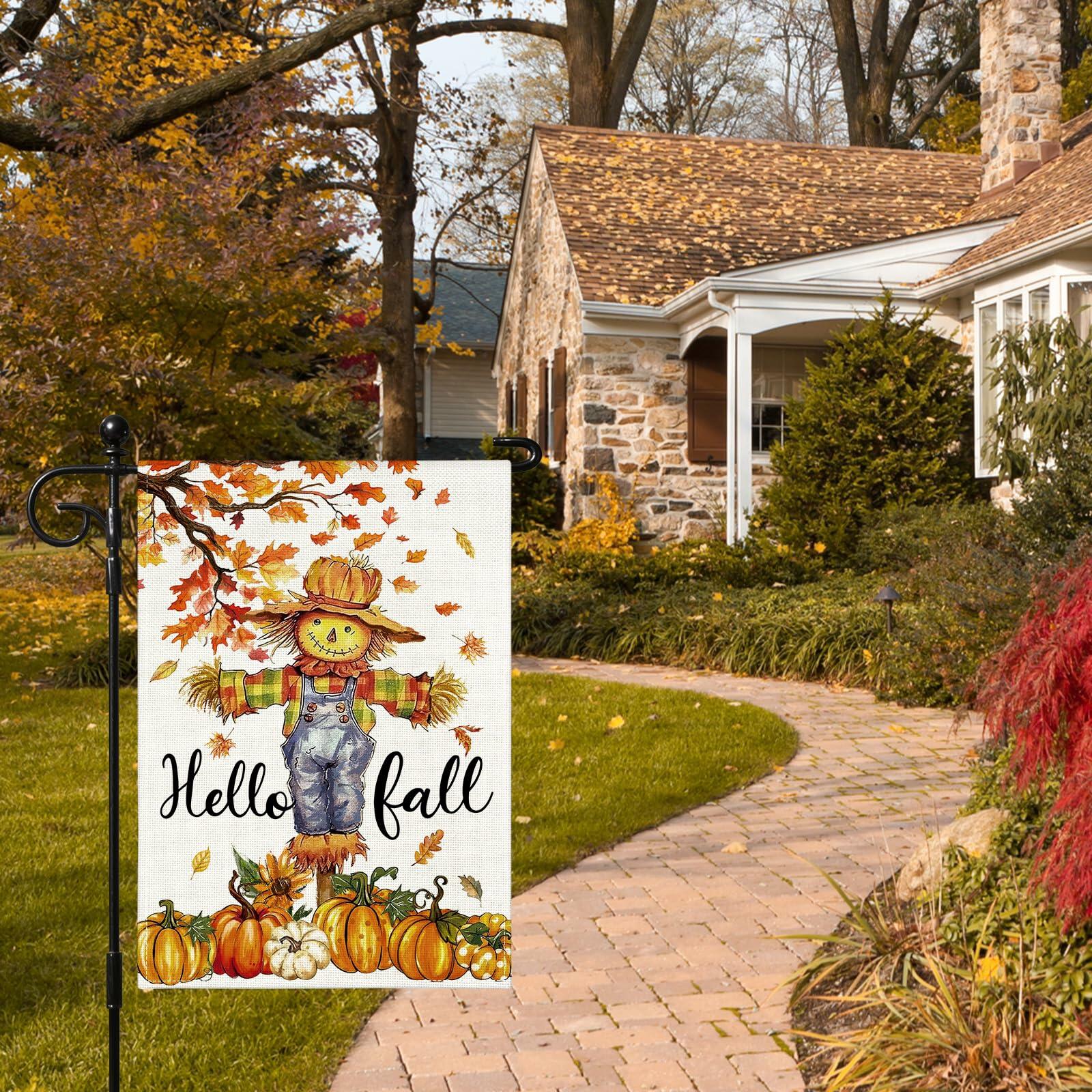 - 【About Size】- This autumn garden flag measures 12×18 inches and features a clear, vivid maple leaves scarecrow pumpkin pattern with "Hello Fall" printed on both sides. When your friends and family visit, they well feel a warm, sincere greeting