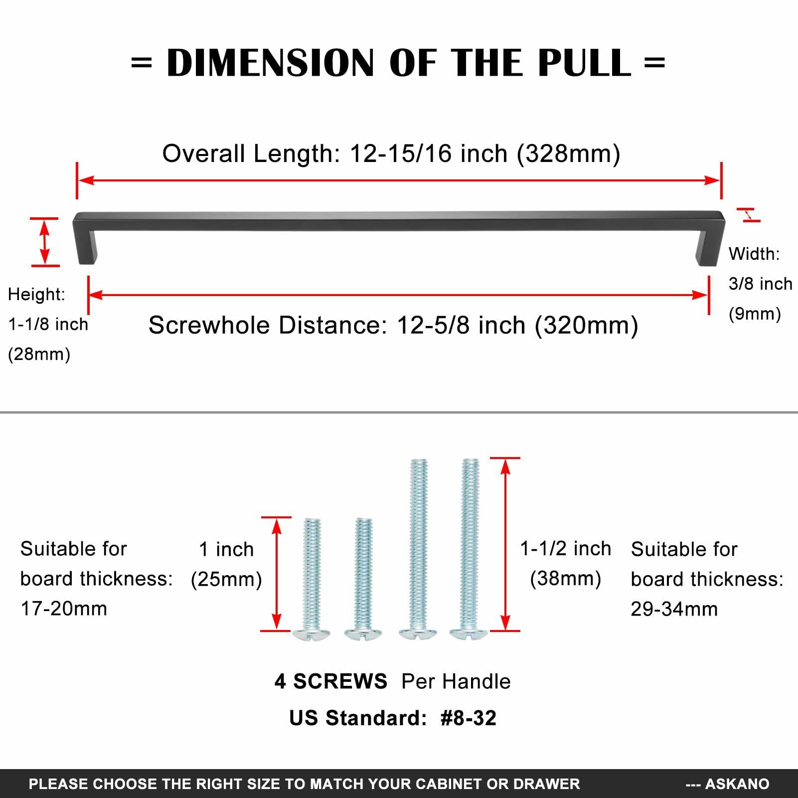 [Measurements] Hole Centers: 12-5/8 inches (320mm); Overall Length: 12-15/16 inches (328mm); Width: 3/8 inch (9mm); Height: 1-1/8 inches (28mm). [Easy Installation] Each pull comes with two sets of screws which fit common cabinet doors and drawers to make installation easier. [Unique Design] Chosen for tactile feel & superior finish, this handle provides a smooth and comfortable grip, as well as impactful visual attraction. [Wide Compatibility] This handle is suitable for multiple decoration, and will give your home a very elegant, modern and beautiful touch. [Notice Before Purchase] Before placing an order, please measure the hole centers of the current pull. And please check whether the overall length of this pull is suitable for the size of your cabinets. antique, retro, vintage, aged, rustic, ancient