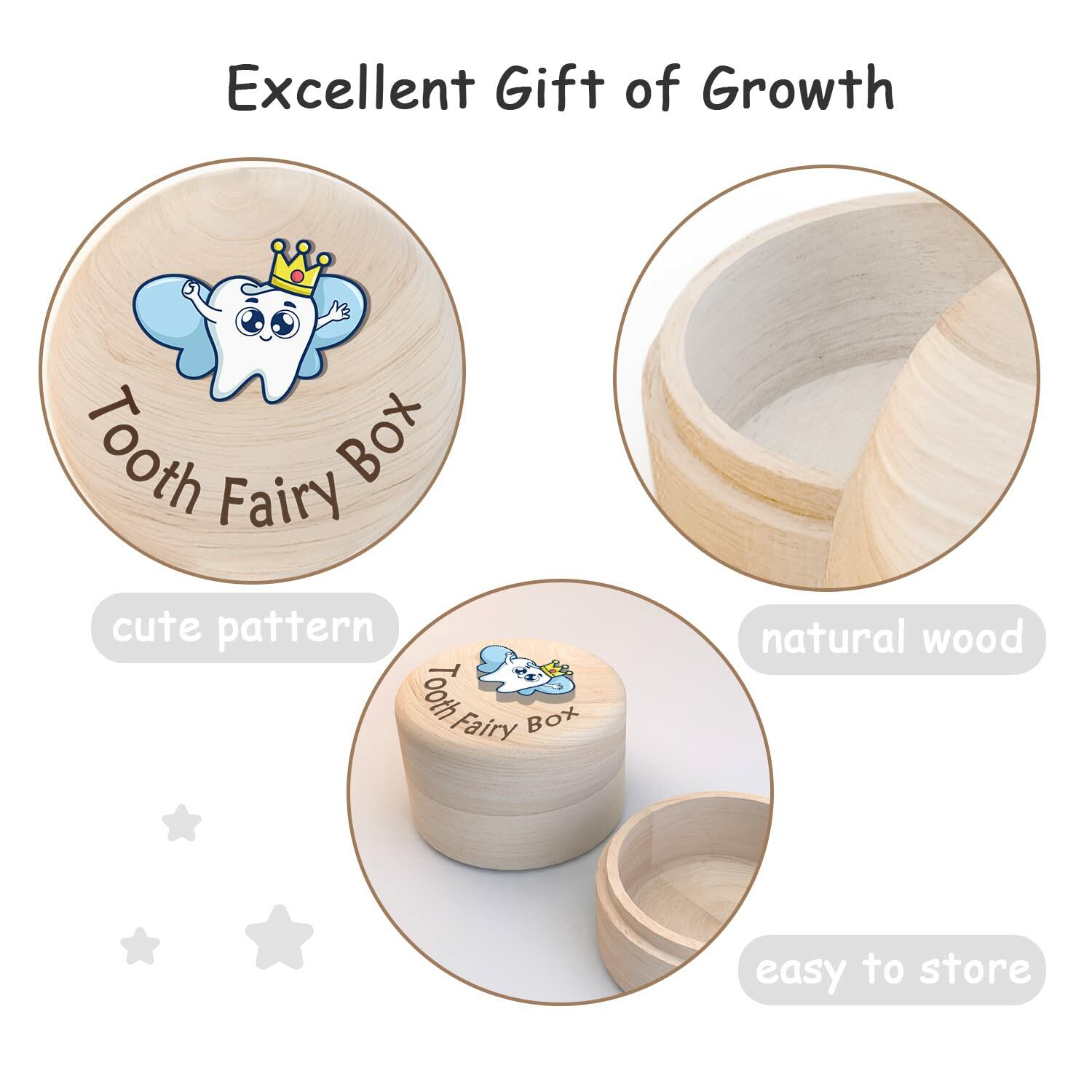 - 🦷Cherished Keepsake🦷 The Tooth Fairy Wooden Box is a great baby tooth keepsake, because every baby tooth is precious to a child, with the Tooth Fairy Wooden Box you can not only keep your baby's teeth as a keepsake, but also protect the precious teeth, and witness your baby's growth with the Tooth Fairy.