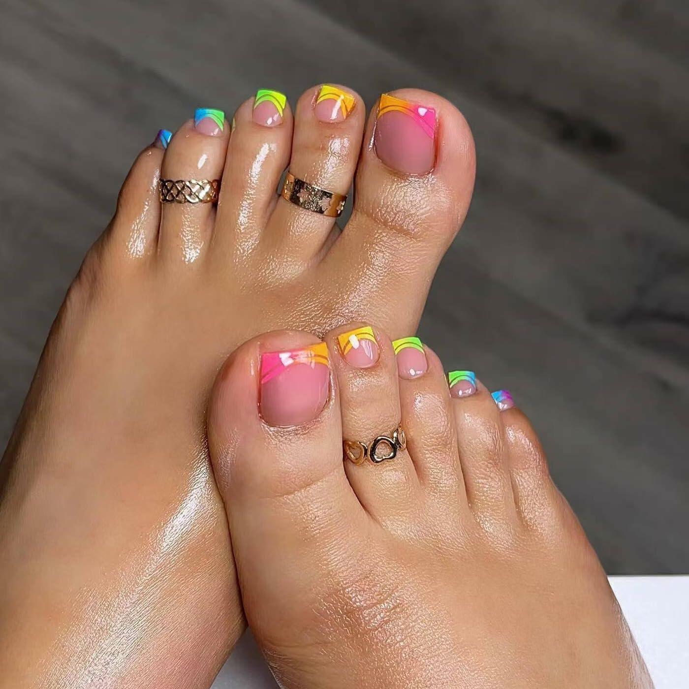 24Pcs French Toe Nail Press ons Pink Press on Toenails for Women Short Square Fake Toenails with Colorful French Tip Design Fake Toe Nails Acrylic Nails Summer Manicure Glossy Toenail Press on Nails