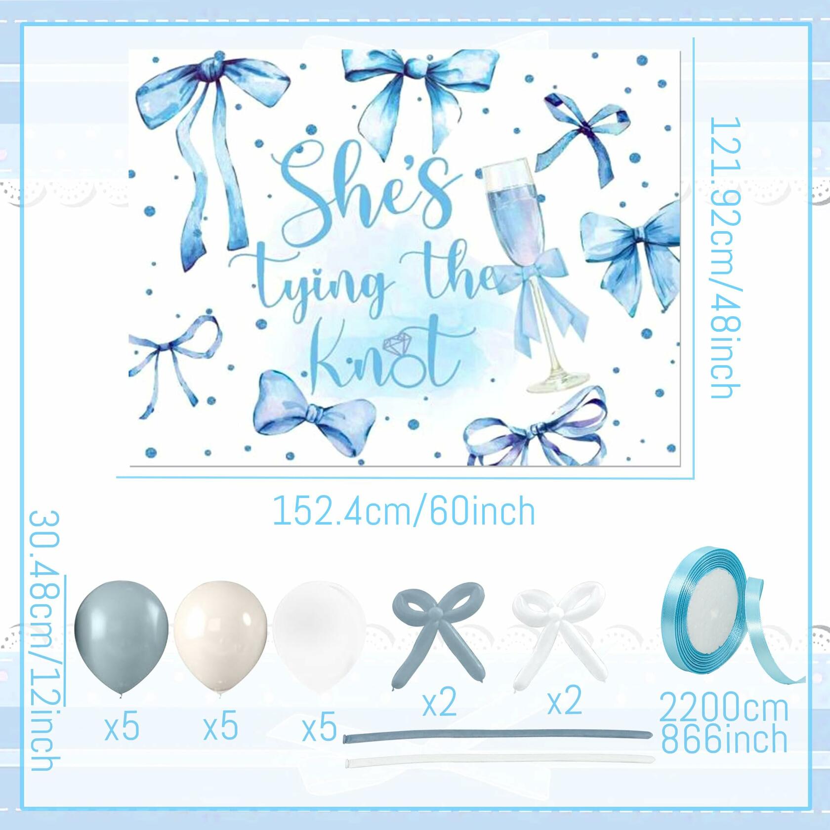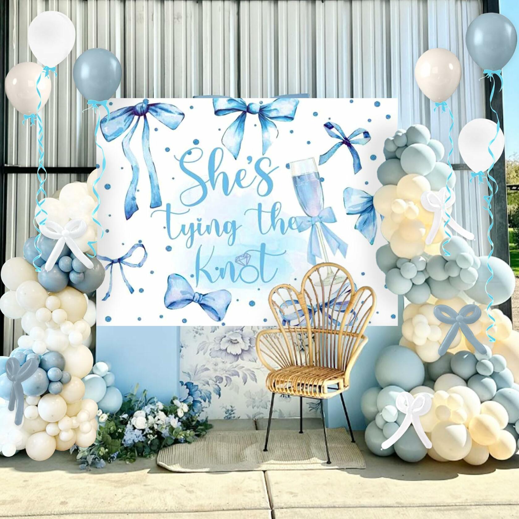 - Products Included: You will receive 1 "She's Tying the Knot" backdrop (48x60-inch), 5 dark blue balloons, 5 white balloons, 5 ice-cream white balloons, 2 light blue long balloons and 2 deep blue long balloons, 1 sky blue ribbon for bridal shower decorations.