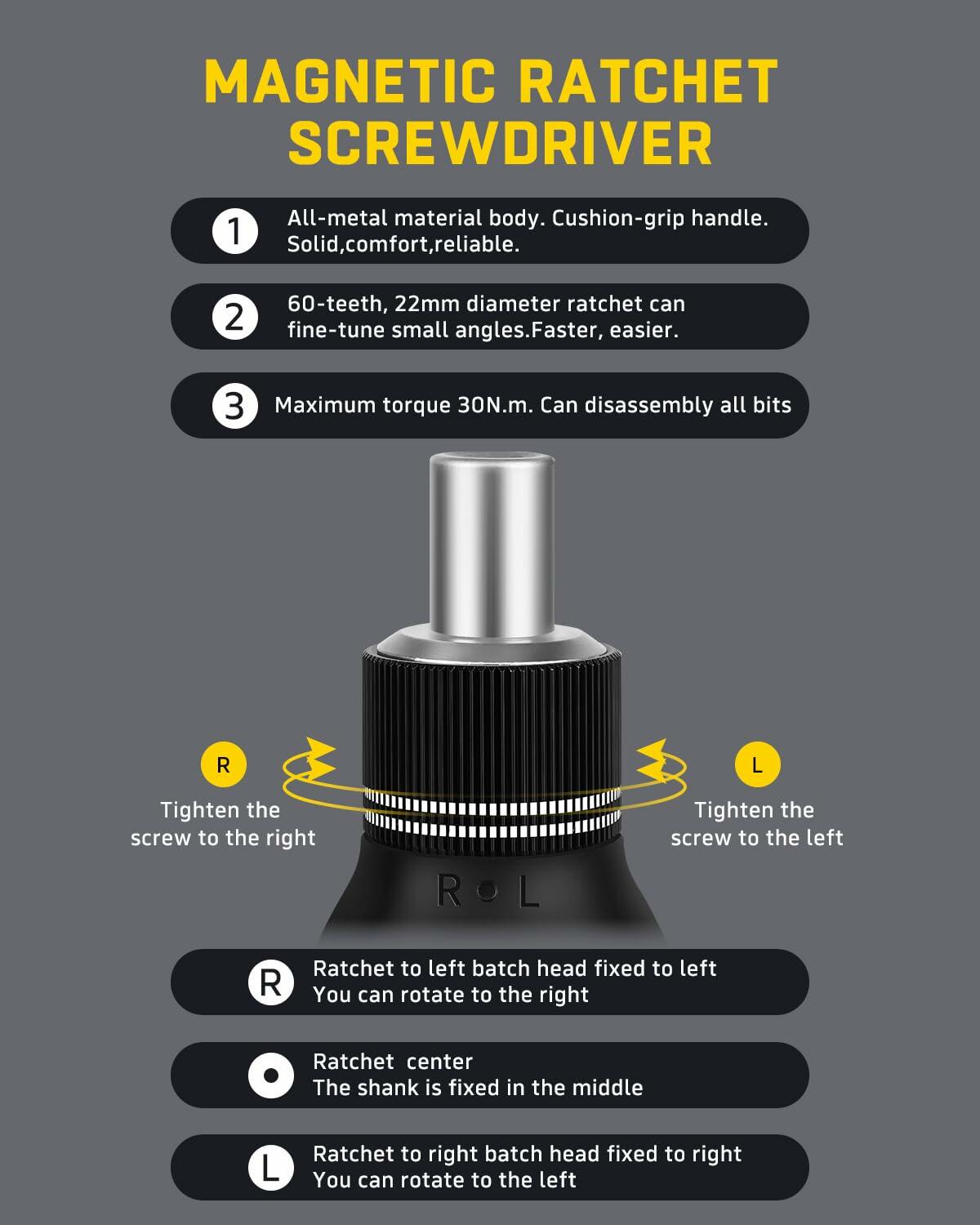 - Ratcheting mechanism for faster and easier driving: The ratchet screwdriver is powered with a 60-teeth, 22mm diameter reversible system to ensure smooth ratcheting in both directions and enable precision adjustment. The all-metal material body is well made to tightly lock and rotate the drill bits. Collar sets ratchet direction at forward, fixed and reverse. Maximum torque is up to 30 Nm, more suitable for high-torque fastening work, time and labor saving.