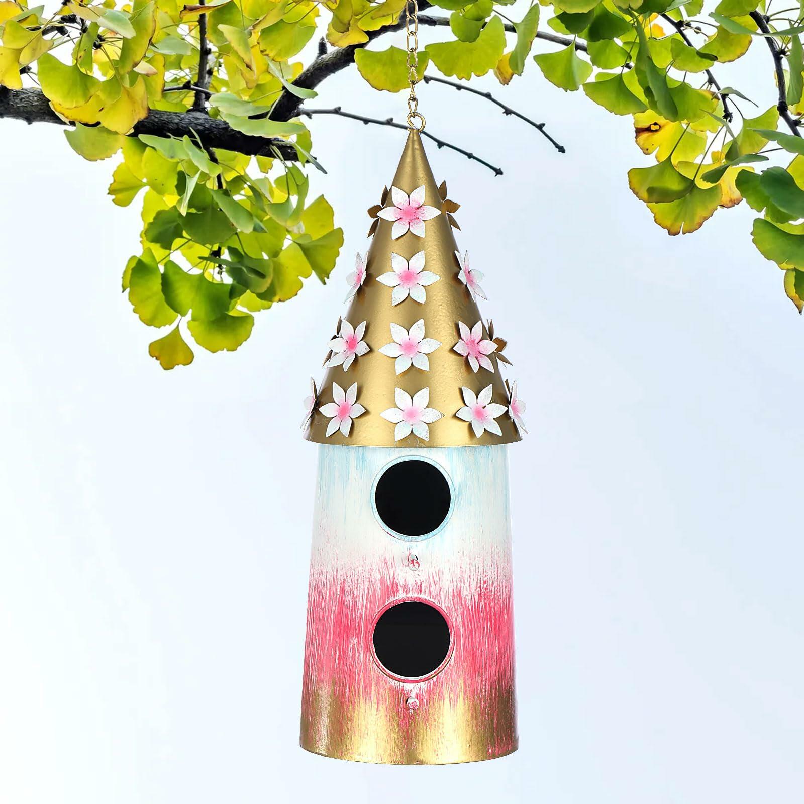 This unique hand-crafted two storey hanging birdhouse featured with gradient color, round roof embellished with many flowers. This vivid color birdhouse serving as both a functional and a decoration piece. Dimension of the bird house is 5 x 5 x 14.5. The entrance of bird house is 1.38 (3.5 cm). Suitable for hummingbird, wren, blue bird and other small birds. Removable clean-out panel on the back for easy clean up. Made of premium metal material, durable and powder-coated to provide the weather resistance. Provide a resting place for feathered friend away from predators, biting wind, cold, and other inclement weather. A decorative accessory for any outdoor space, the birdhouse comes with a sturdy chain and a hook, so it can be easily hung from a branch vines or pole, but it's just as welcome on a top of a pedestal or post in your garden or backyard. If you are a bird lover, you will not miss this handcraft bird house. Create a bird watching sanctuary in your own backyard with this fun and unique birdhouse! Its also a a thoughtful gift for a keen gardener or birdwatcher.