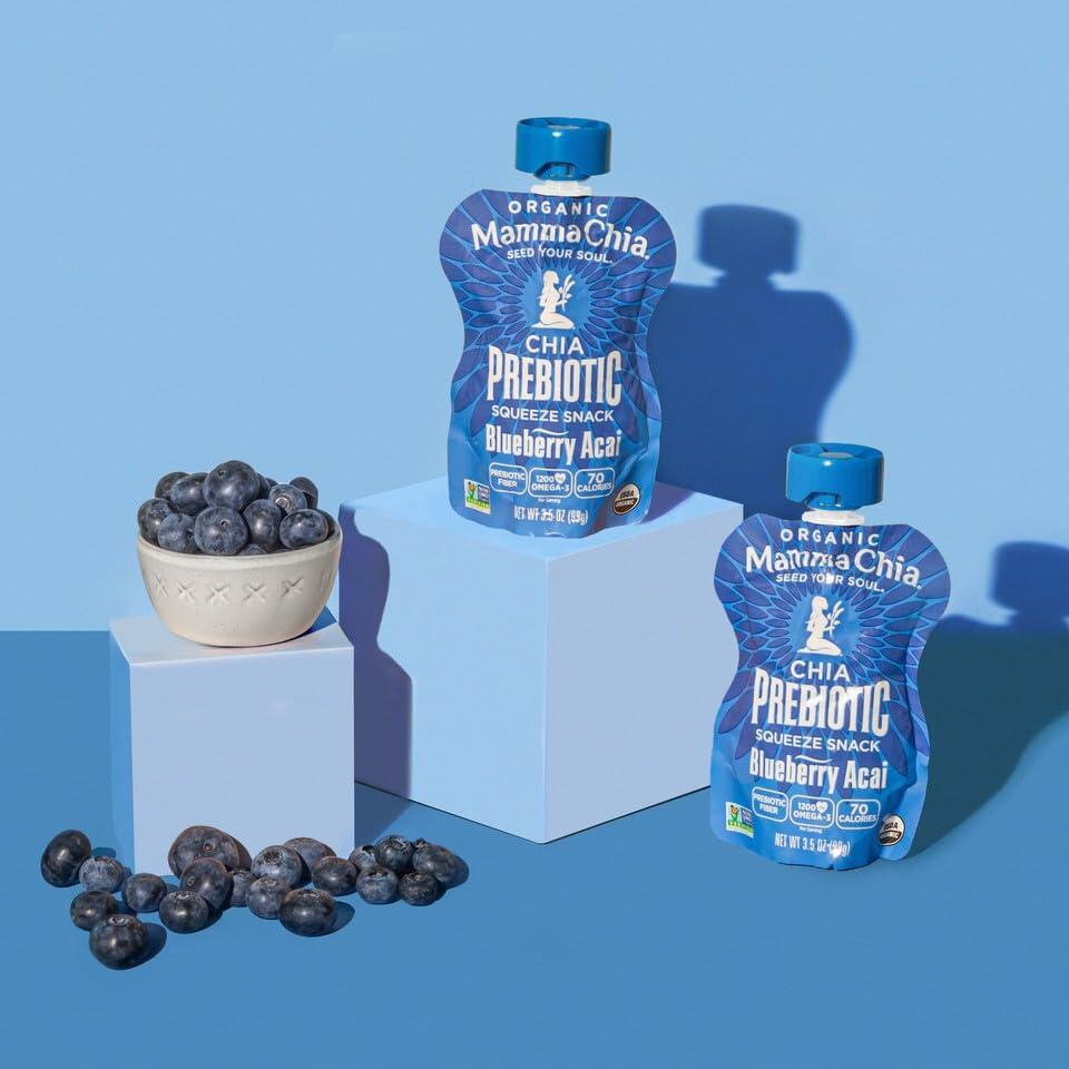 - Mamma Chia Organic Prebiotic Squeeze Snack, Blueberry Acai, Fiber-Rich Prebiotic Gut Support, USDA Certified Organic, Non-GMO, Vegan, Gluten Free, 14 Ounce (Pack of 6)