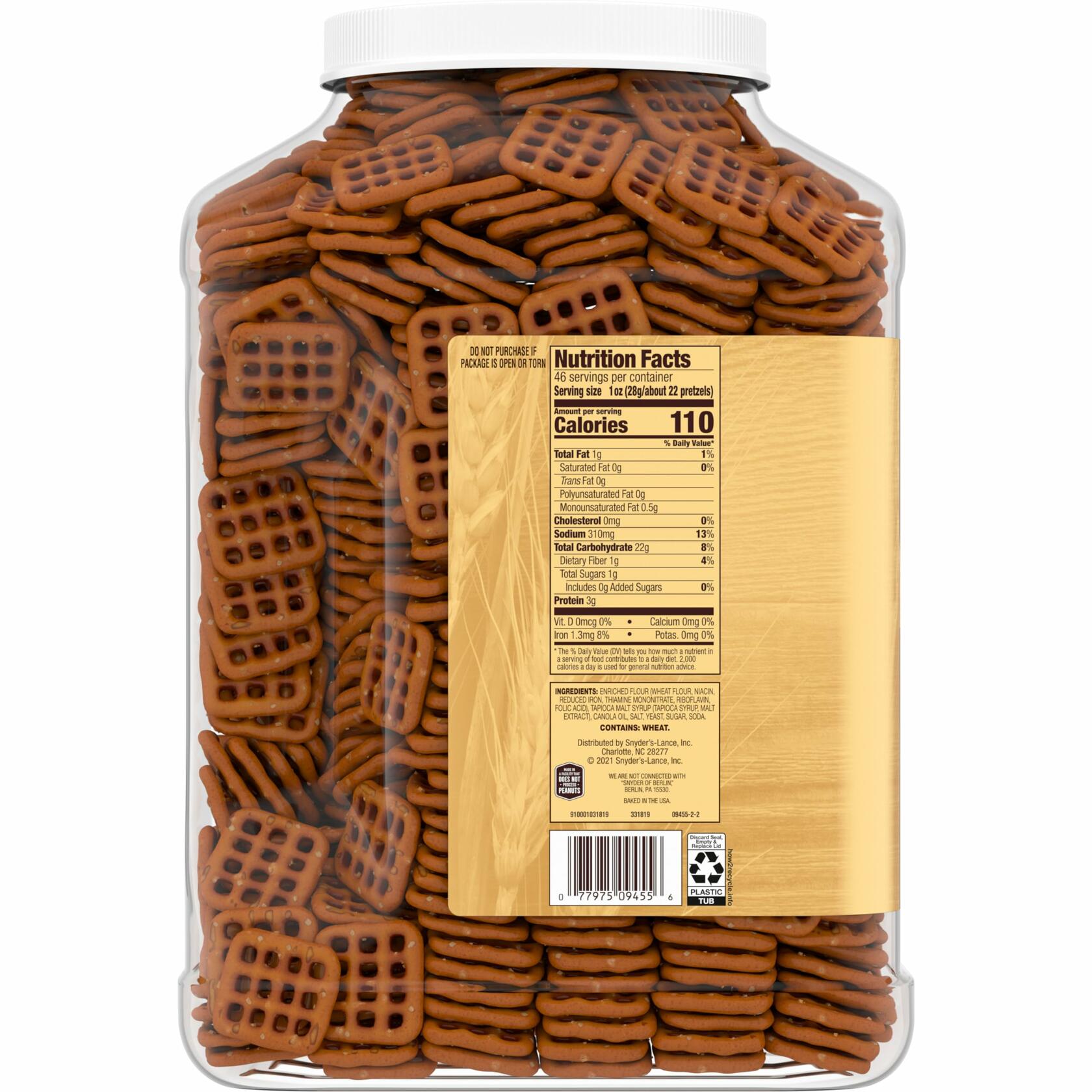 - Large tub: bulk size 46 ounce canister of Snyder's pretzels with resealable lid for stocking your pantry