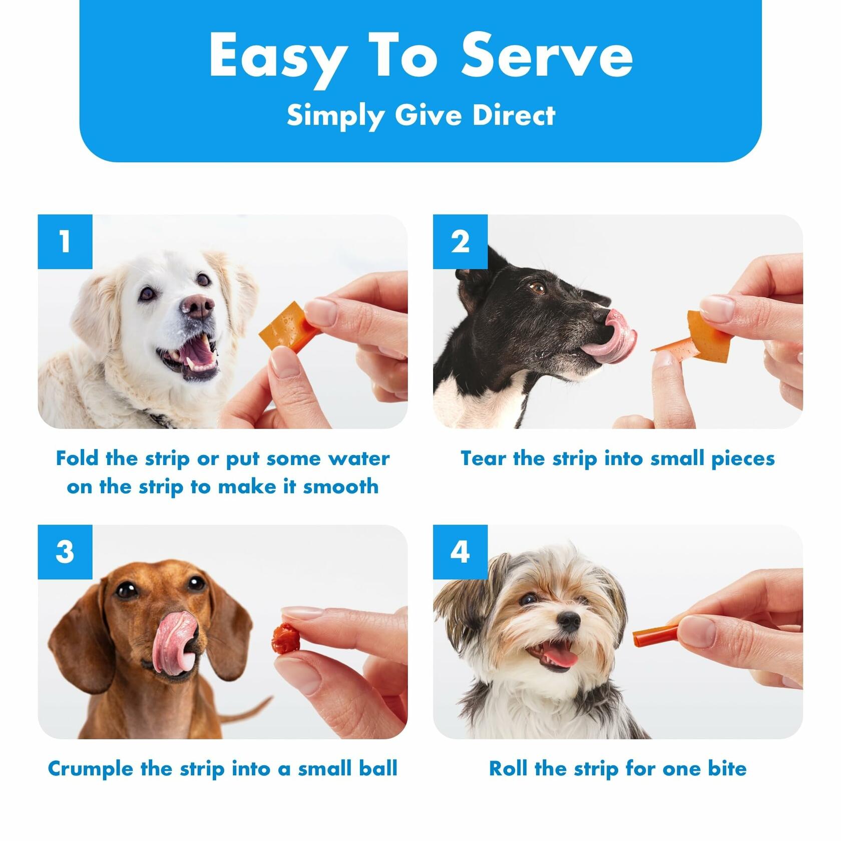 - 4 Feeding Tips: Gently shake the strip supplement, give your dogs time to sniff to get used to it, and make them interested. Or Roll it, Fold it, and Tear it into pieces for just one bite.