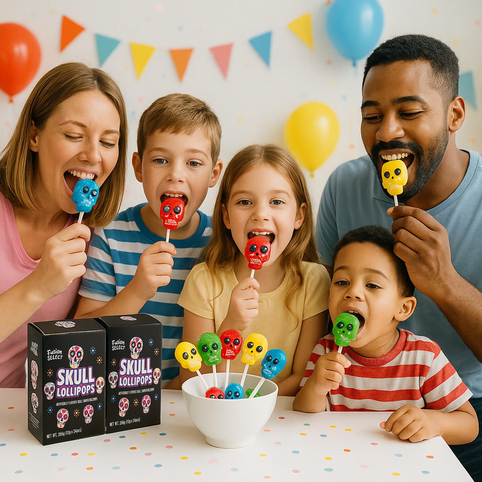 BestBy06/27 Fusion Select Sugar Skull Lollipops 24 Pc Colorful Halloween Candy