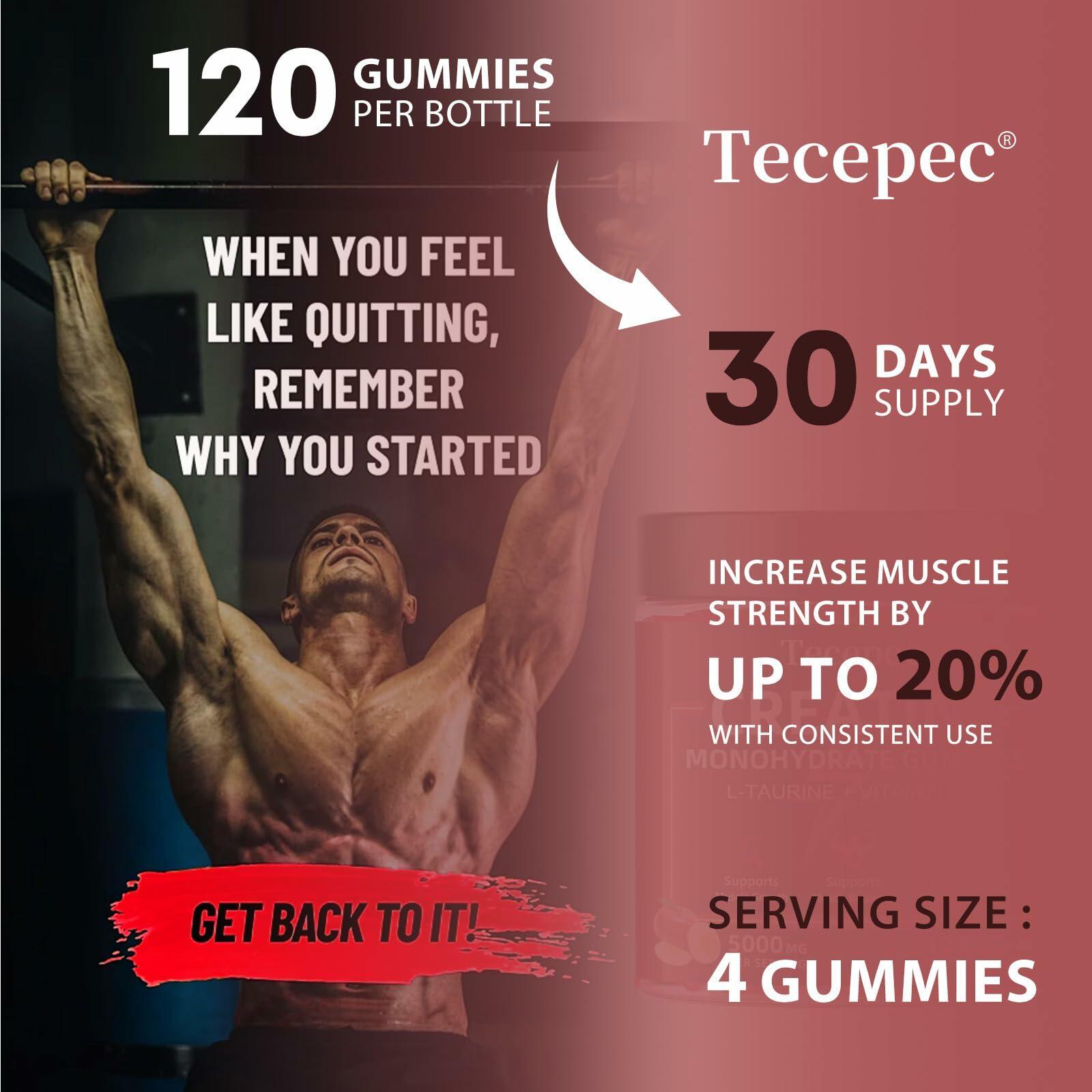 - Good Benefits: As we all known that don't replenish creatine at post-workout is equivalent to exercising for nothing. Tecepec creatine monohydrate gummy contains 5000mg creatine per serving, can boost energy, improve muscle strength and endurance for improving exercise performance, also better for muscle recovery after exercising.