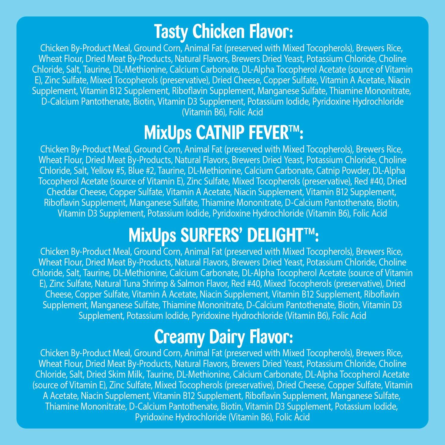 Cats love the delicious, crunchy taste of Temptations, so give your cat purr-worthy Temptations Classics and MixUps Cat Treats Variety Pack, and they’ll come running the moment you open the pack. Each of these catnip, chicken, shrimp, salmon and dairy-flavored cat treats has less than 2 calories and provides an irresistible combination of both crunchy and soft textures. They also come in a stay-fresh pouch, so your feline friend can enjoy their favorite cat snack when you open it, but not when they shouldn’t! These Temptations Classic and MixUps Cat Treats Variety Pack are a perfect addition to your cat’s regular feeding routine: Use them as a treat, a meal, or a cat food topper. Temptations Classic Cat Treats are the purr-fect way to show your feline friend how much you care.