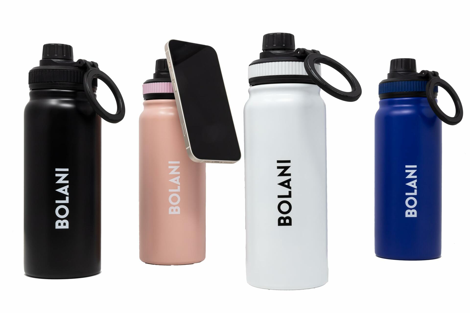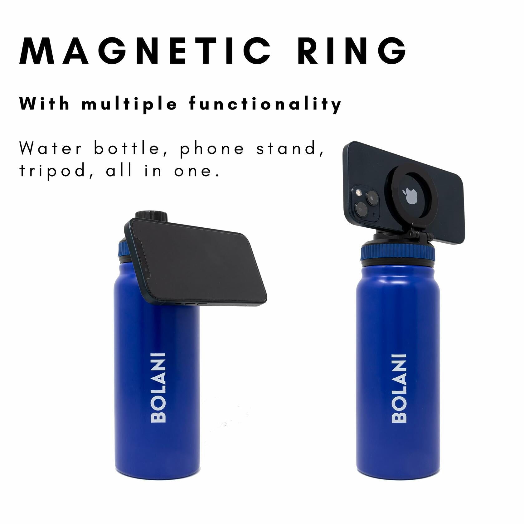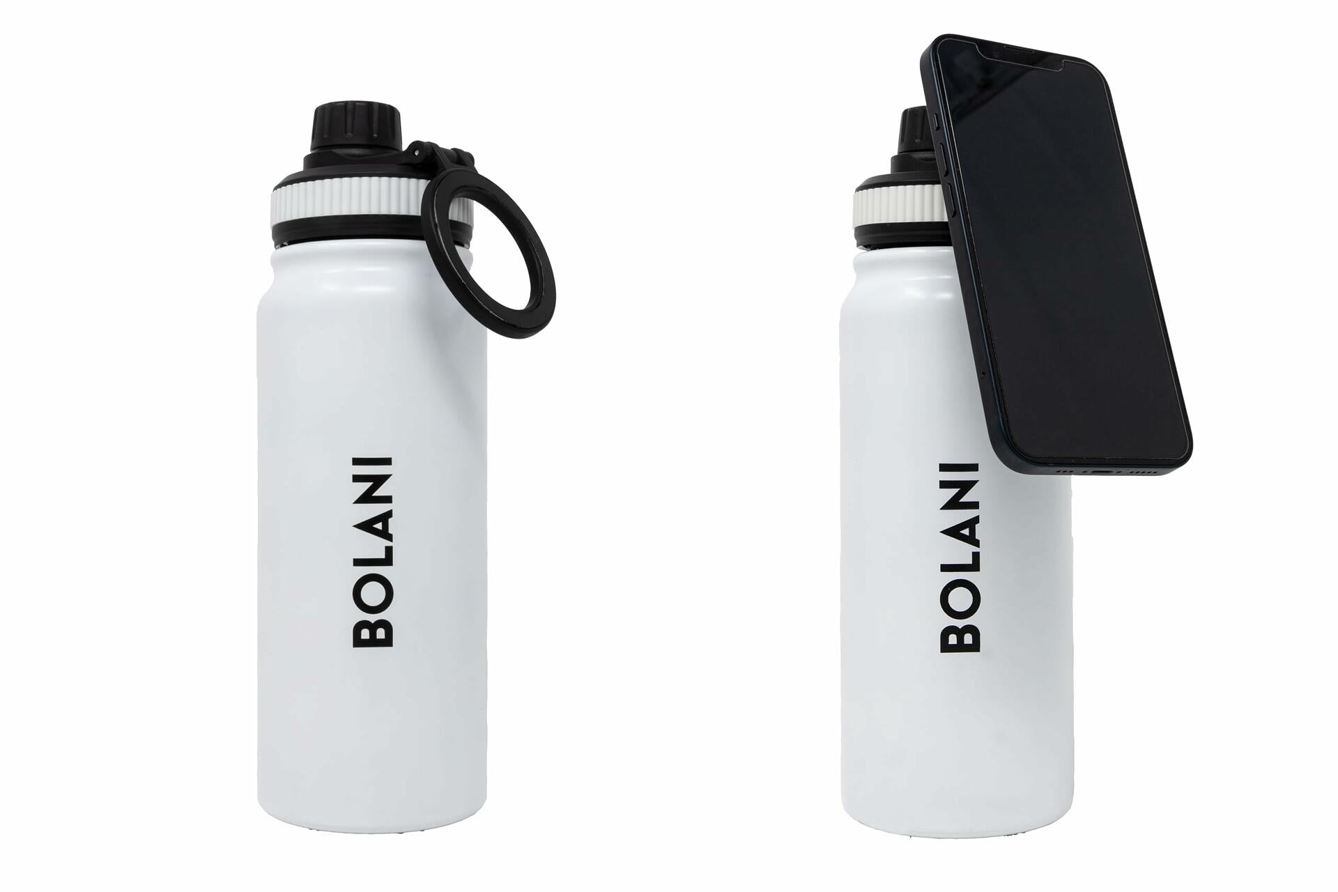 The BOLANI Magnetic Water Bottle provides the perfect assembly of design, form, and function. Its stainless steel construction is tough enough to endure long days at the gym, school, or even at work for anyone on-the-go. The insulation of this bottle ensures maximum temperature control; cold drinks stay icy and hot beverages heated. Plus, its double walled sweat free design means you can take it on-the-run without running into any messes! Add a modern touch with the included MagSafe compatible ring; it keeps your phone securely in place while also providing a comfortable grip. Compatible with iPhone 12 and above, the sleek and chic design comes in a variety of colors that mix style with functionality. Choose between black, white, blue or pink colors — no matter the preference, there is something for everyone. The bottle comes with a leak proof cap and is easy to clean without a hassle. Sip on your favorite drink through BOLANI's spout lid. With many benefits — what are you waiting for? Get yours today!