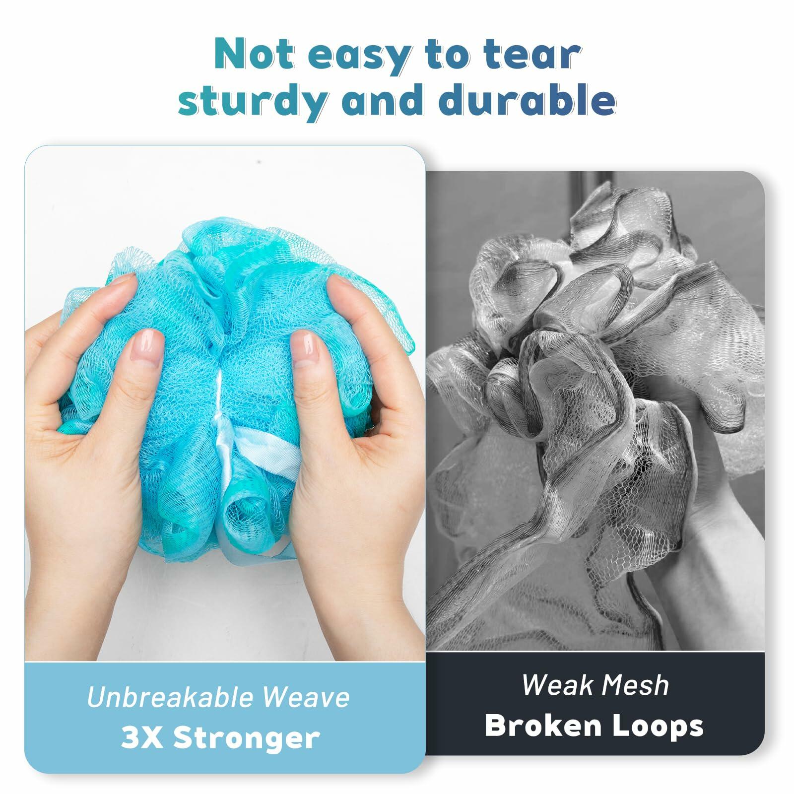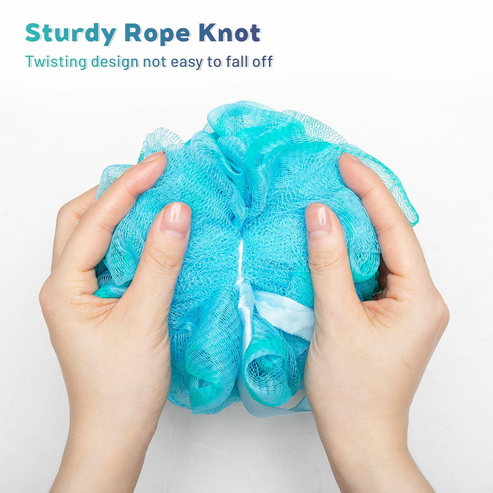 Premium Shower Loofah - Ultimate Bath Companion for All Experience spa-level cleansing at home with our durable, high-foaming loofah pack designed for men and women. Each shower loofah features advanced reinforced knotting, so it stays intact through daily useno fraying or falling apart. The ultra-dense, fluffy mesh creates a luxuriously rich lather with 20% less shower gel, saving you money while delivering a deep, gentle clean that removes dirt, dead skin, and oil. Weighing 75g and measuring 5.9 inches, this extra-large loofah sponge covers more skin in less time, turning your daily shower into a relaxing ritual. The set includes four stylish color combosgreen/purple, blue/green, blue-white-purple, and blue-white-greenperfect for matching bathroom decor or assigning to family members. A ribbon lanyard lets you hang it to dry hygienically, while the vacuum-packed design ensures freshness (just use 34 times for full fluffiness!). Crafted from soft PE material, this bath scrubber for body is gentle enough for daily exfoliation yet tough on grime. Whether youre a man needing a rugged clean or a woman seeking smooth, glowing skin, this loofah pack delivers. Replace every 36 months for optimal hygiene.