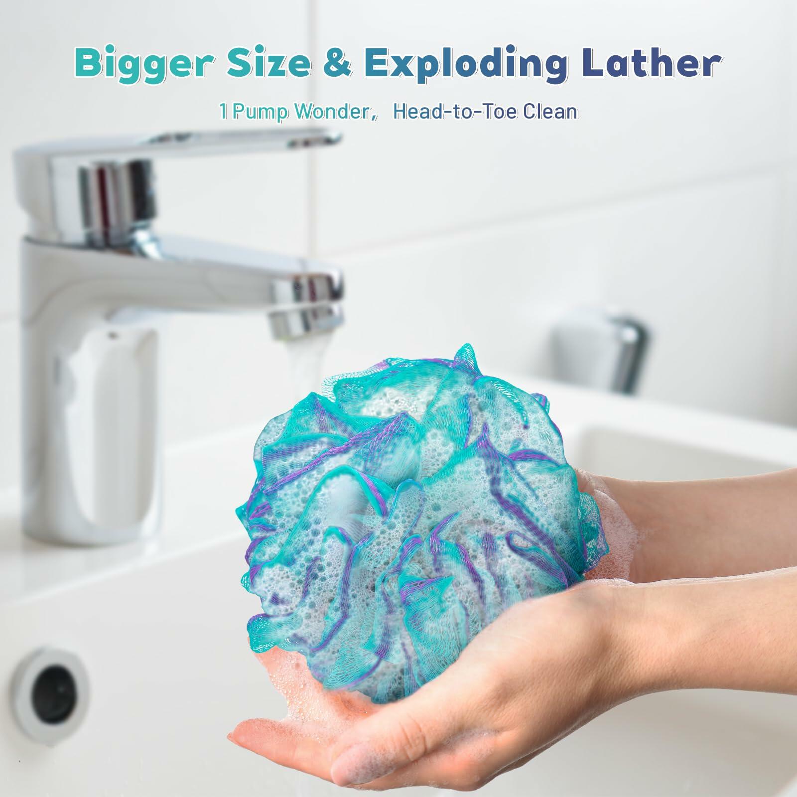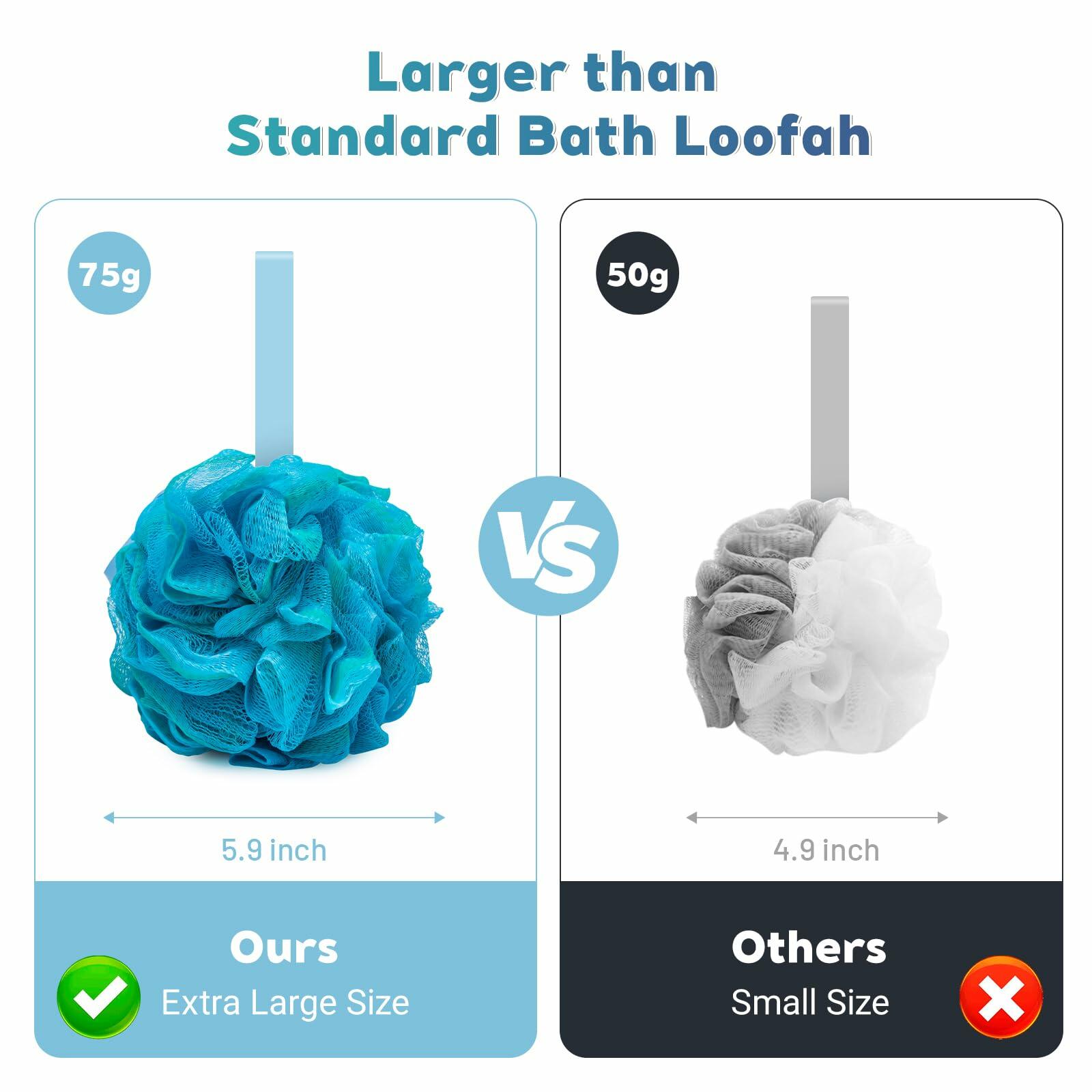 - Oversized for Maximum Lather:Weighing about 75 grams and measuring 5.9 inches, our extra-large shower loofah stands out from regular bath sponges for shower. Its plush, dense design whips up a mountain of rich, creamy foam, turning your daily shower into a luxurious spa-like experience
