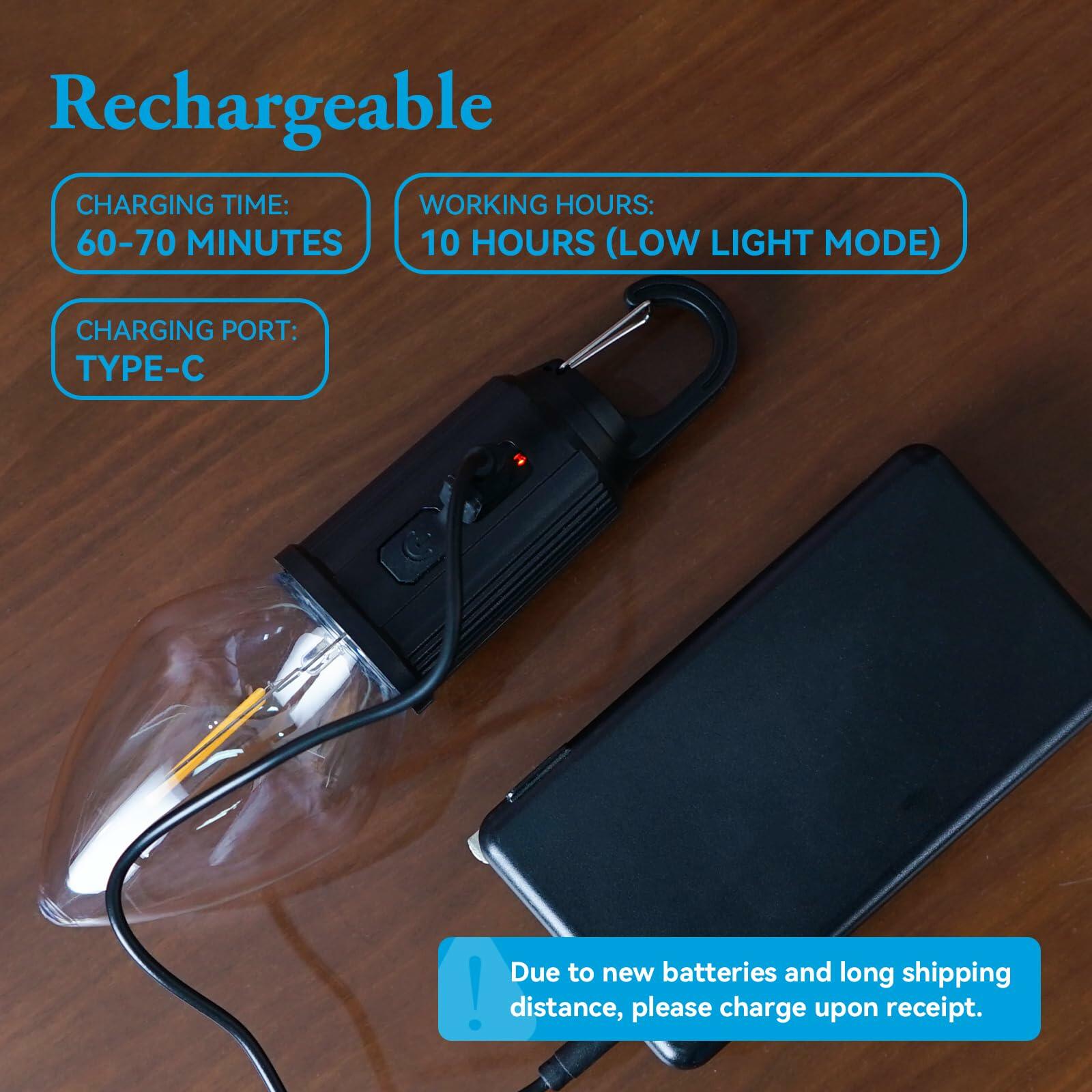 - Quick Charge and Long-Lasting:Our battery powered lantern features a rechargeable battery,eliminating the need for replacements and saving you money.Using a Type-C charging cable,it fully charges in just 60-70 minutes.On the lowest brightness,it lasts up to 10 hours,and up to 8 hours on the highest brightness.Ideal for outdoor battery operated lights and battery operated light bulb, Our battery operated lights outdoor offers both efficiency and convenience,Ideal for outdoor use
