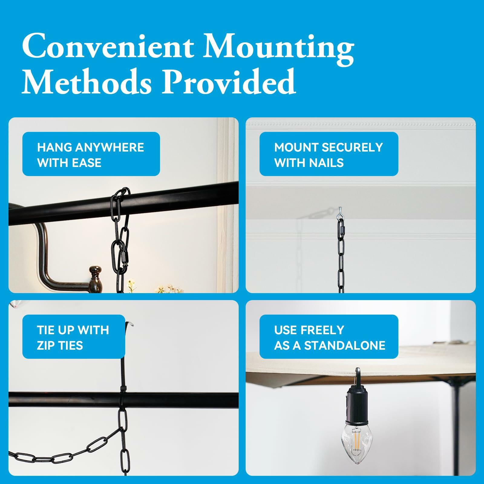 - Applicable in multiple scenarios:Our battery operated outdoor chandelier comes with a portable 1.5M iron chain and various screw heads,allowing it to be nailed into wood,hung from tree branches,or tied to high pergolas.Our outdoor gazebo light Can also be used alone, no chain required,the bulb has a hook,the hook on the bulb makes it ideal for use as a hanging tent light, emergency light,or night light.This versatility makes it great for hanging outdoor lights and outdoor lamps for patio,providing flexible lighting solutions for various outdoor settings