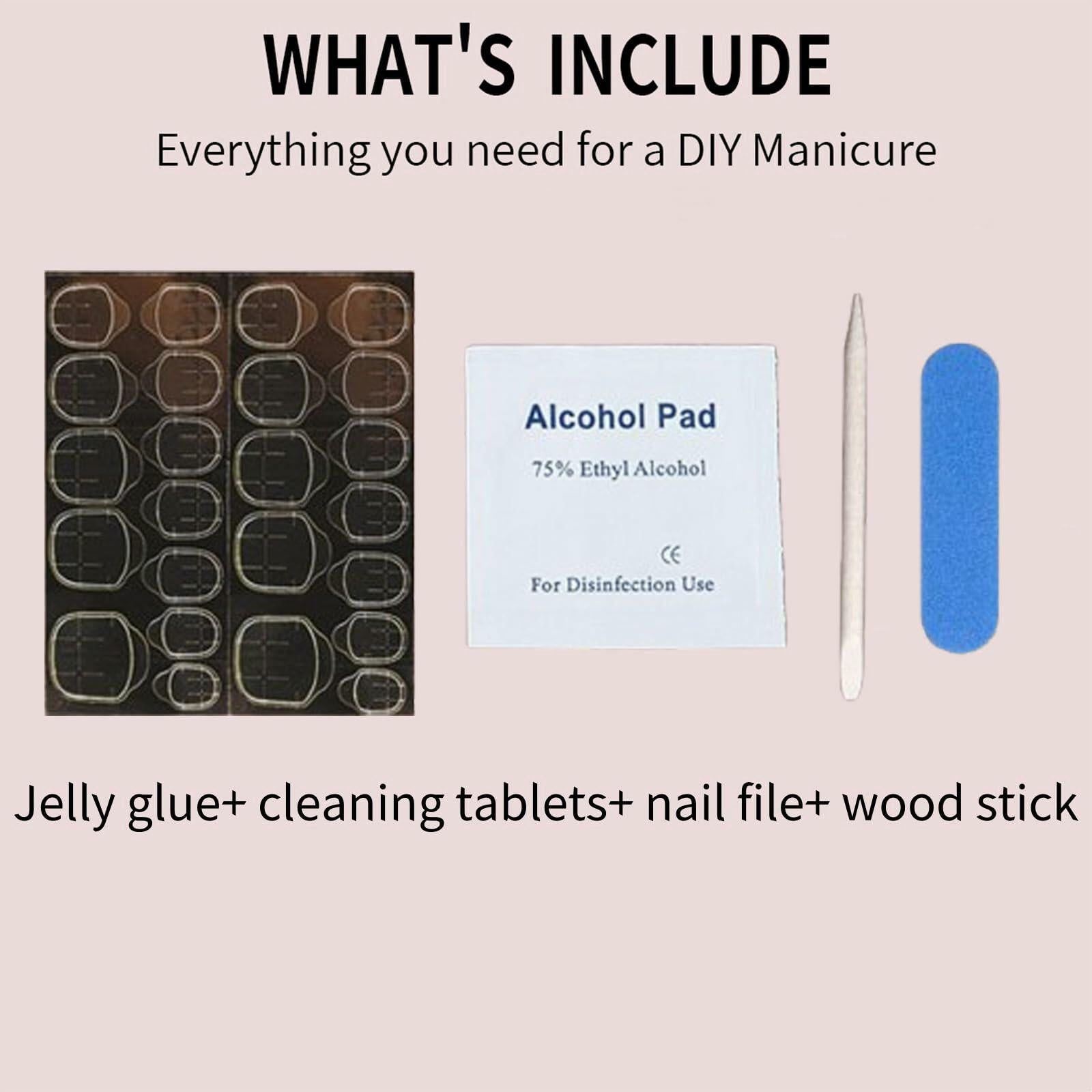 - Package Content:You will get 24 press on nails short of 12 sizes, 1 nail file, 24 jelly stickers, 1 alcohol pad,and 1 wooden stick for removing nails