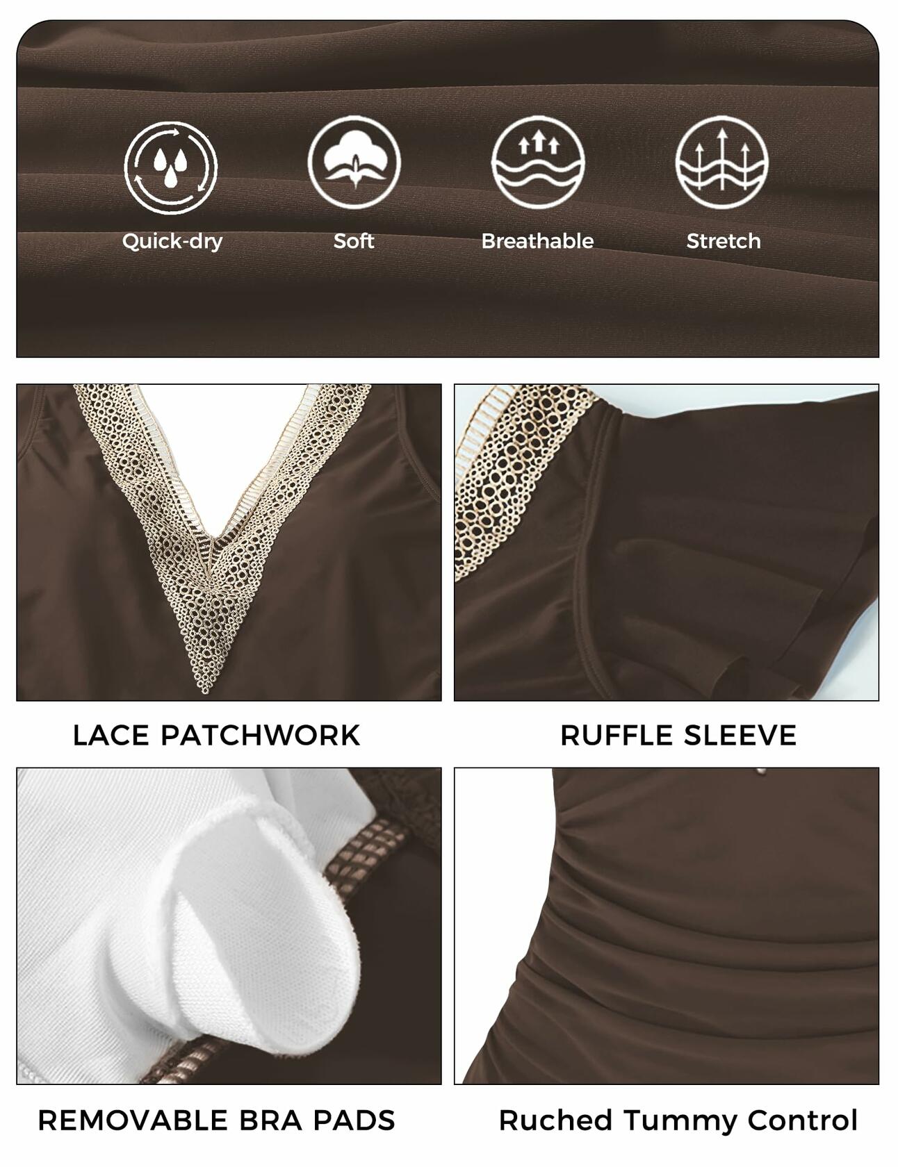 Buauty Womens One Piece Swimsuit Tummy Control Deep V Lace Ruffle Coffee Size XL