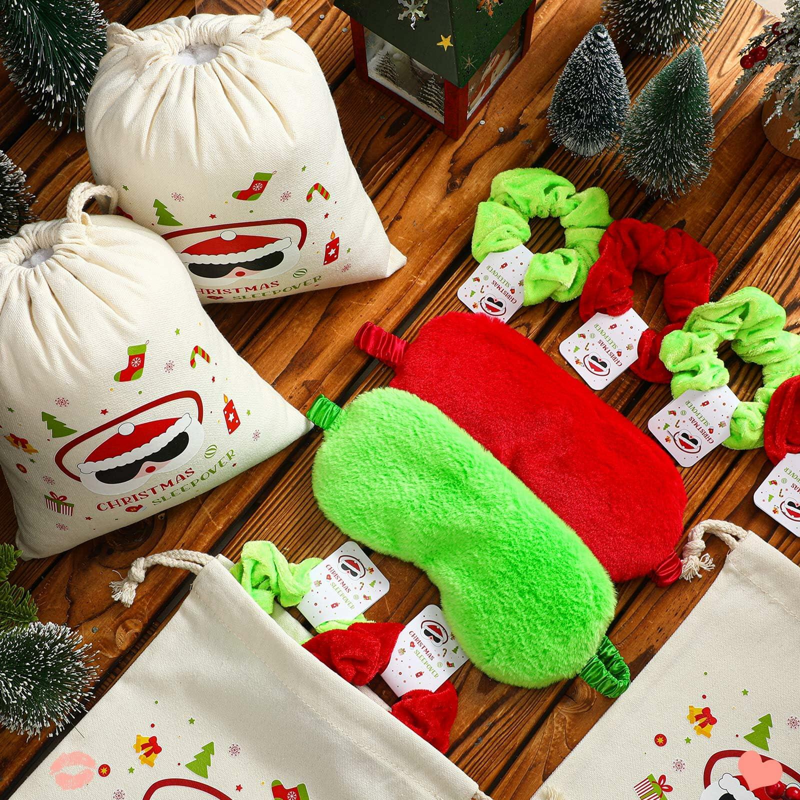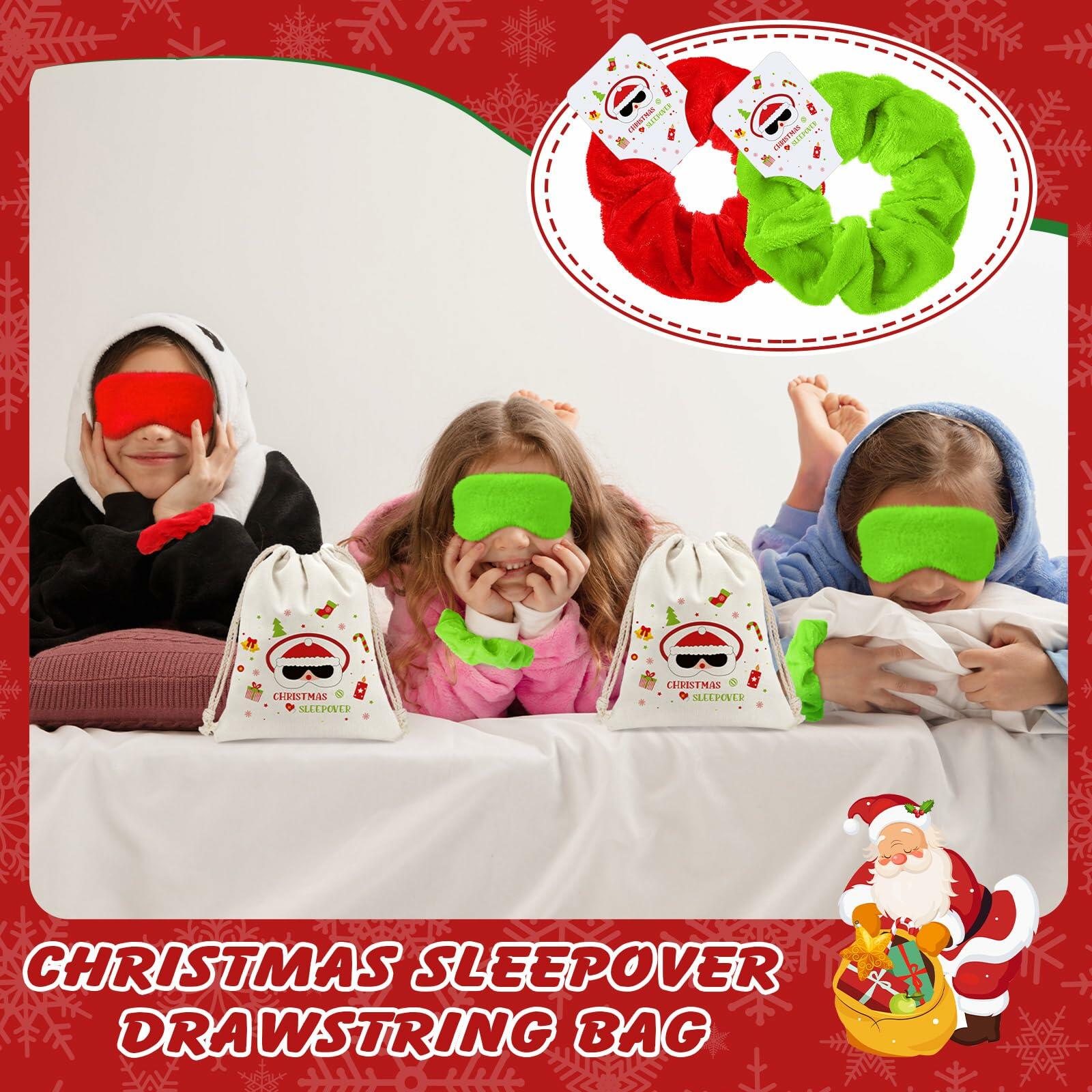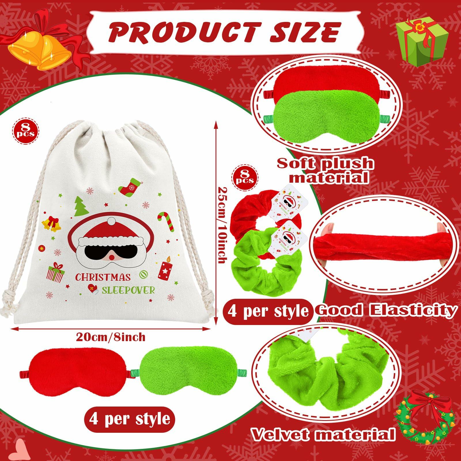 - Stylish Christmas Themed Design: the style of the sleepover party favors is Christmas themed, printed with Santa Claus on the bag, making it an ideal choice for the holiday season; You'll feel the festive atmosphere the moment you put on the plush eye mask and hair cord or handle the linen bag; This kit will be ideal for your Christmas costume plan, bringing warmth and joy