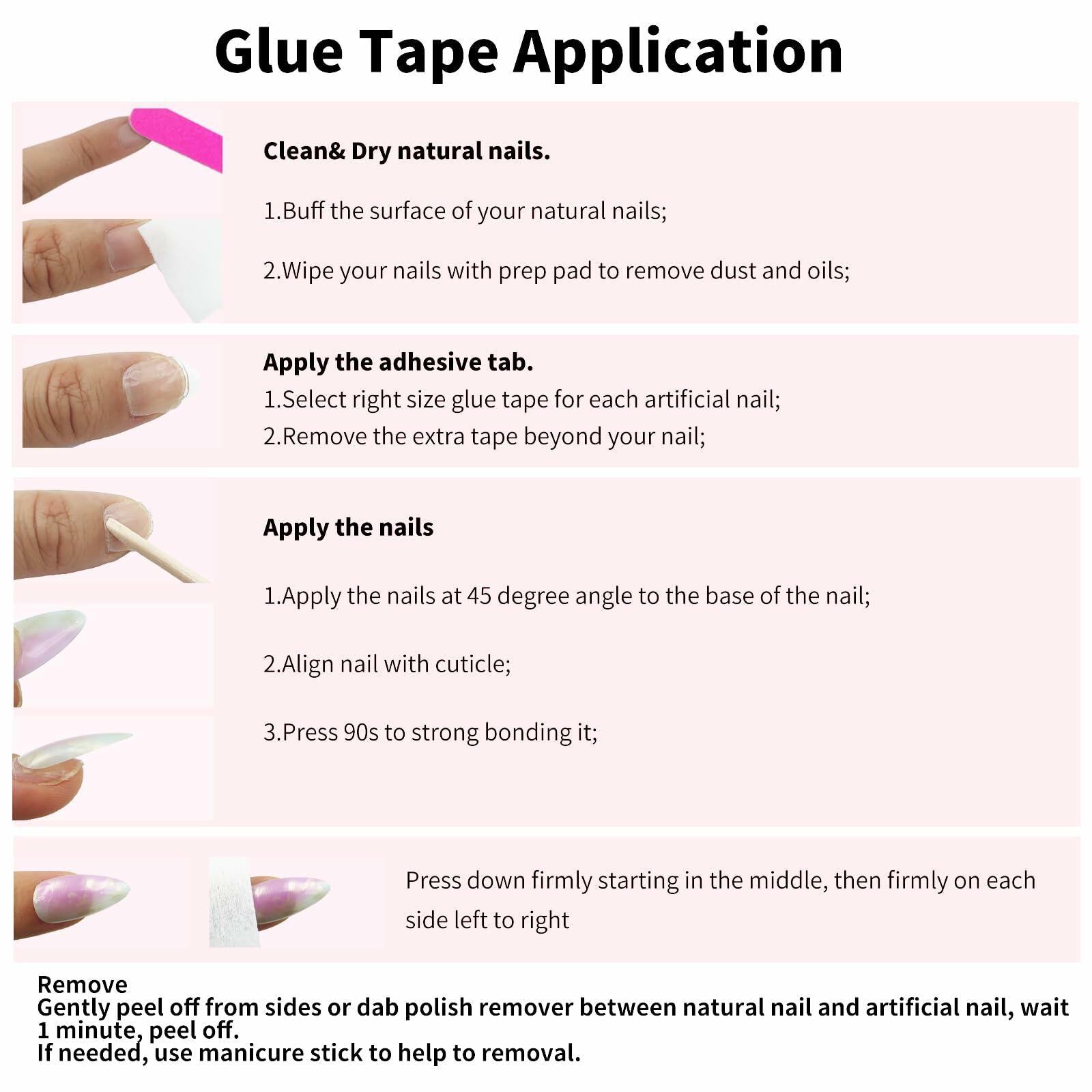 - Easy Application: Simply apply the adhesive tabs provided and press the artificial nails onto your natural nails for a quick, temporary manicure.