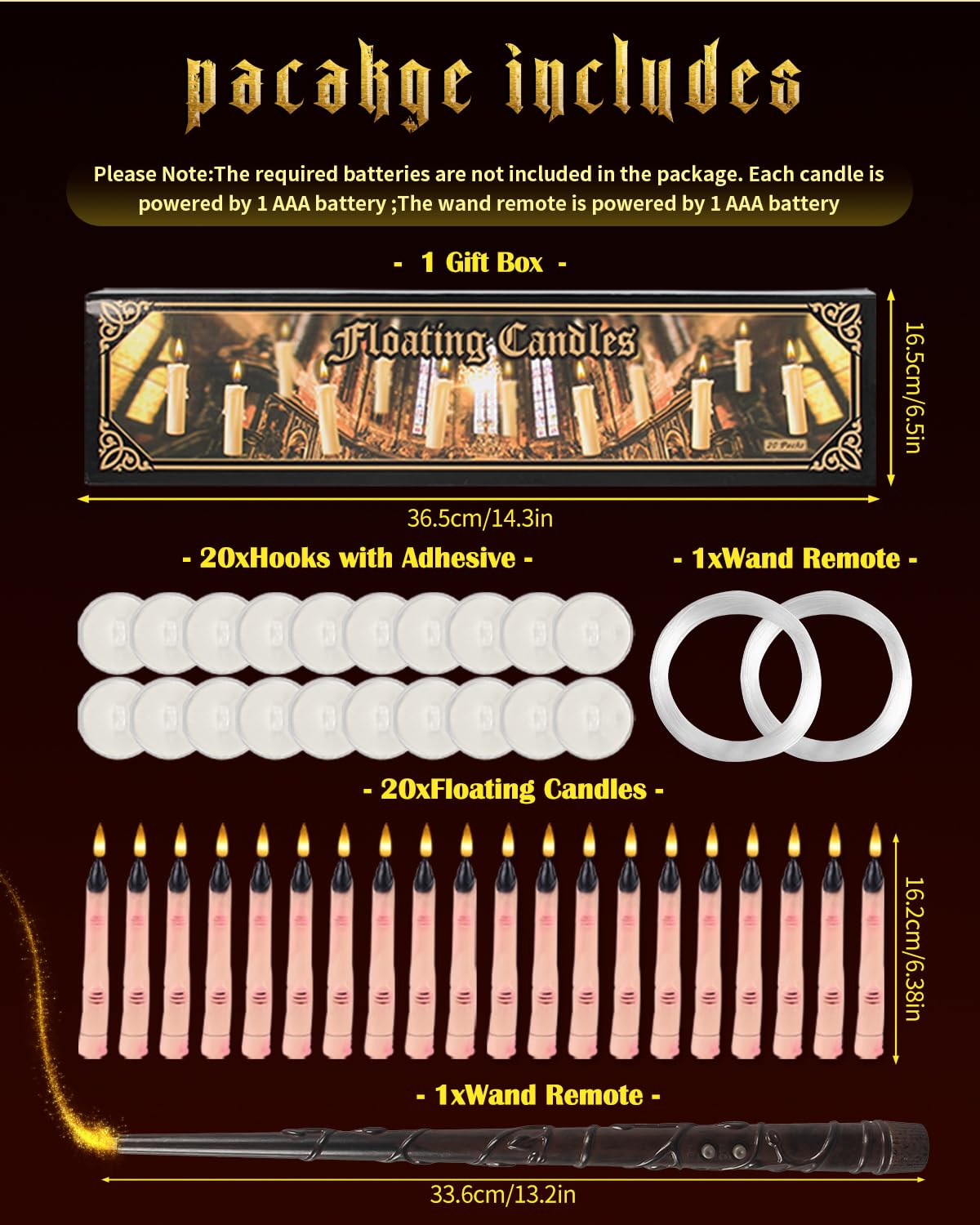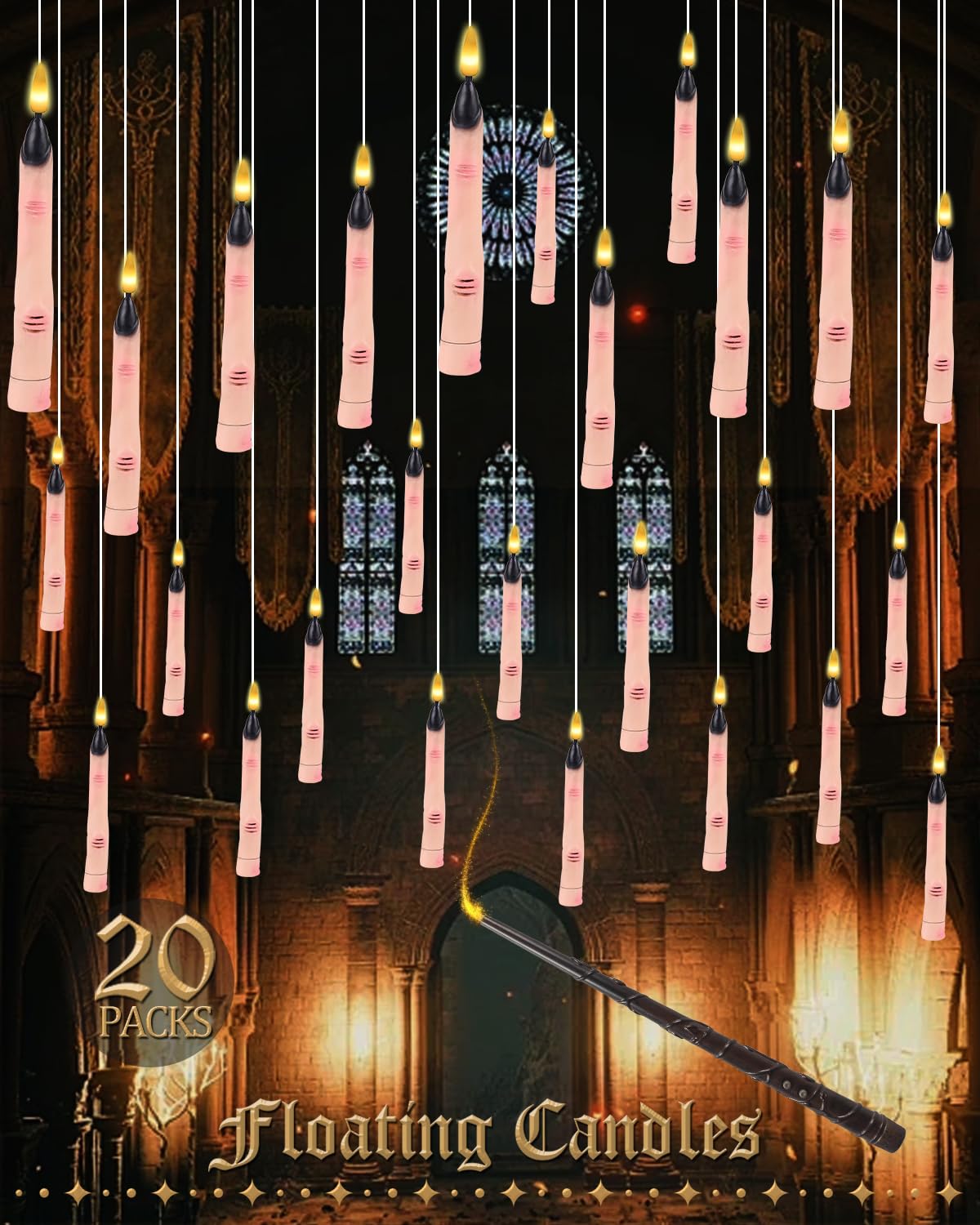 - Magical Floating Effect:20 pcs floating candles with 4-foot fishing line, 20 hooks for hanging, and a 13-inch magic wand remote for an eerie floating illusion, enchanting all ages.