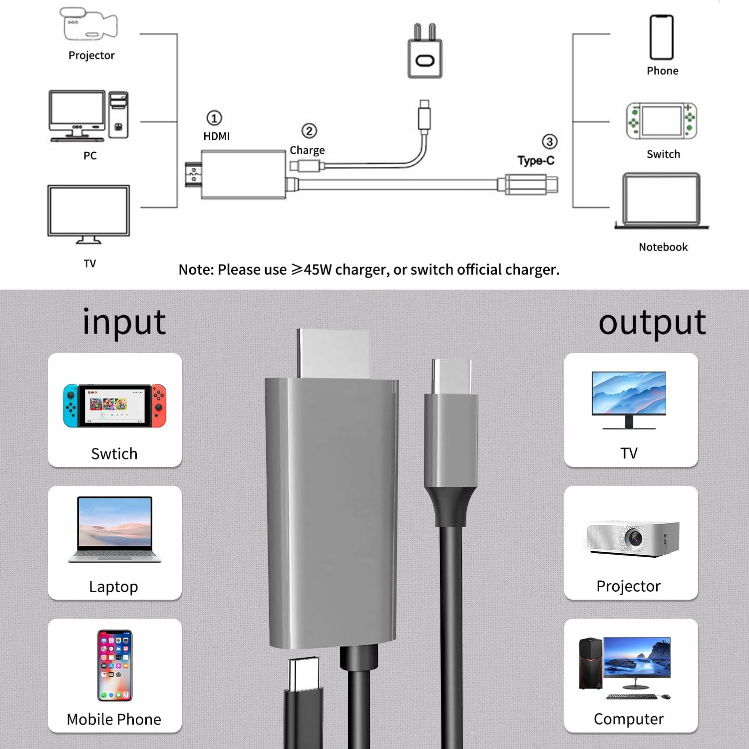 - 【Excellent Replacement for Switch/Switch OLED Dock 】Recommended by famous game bloggers from JP&US! Our product Type-C to HDMI Adapter= HDMI cable + USB Type-c cable + Official Huge Dock. It can replace your Huge Docking Station and complex cable connection. Only 78.7inch, which is lighter than the official Switch Dock. Note: Need to use Switch charger or 45W and above charger to support TV and display.