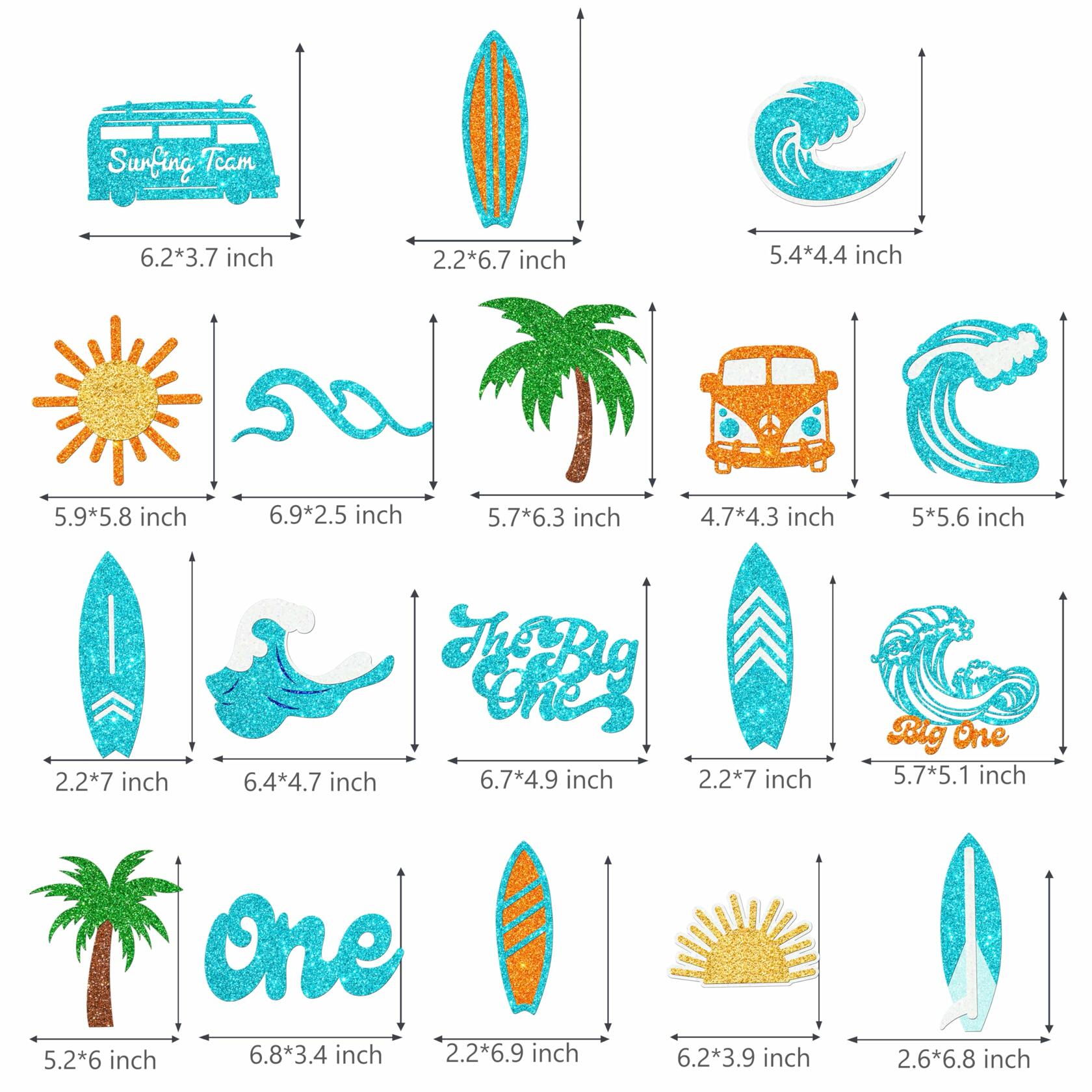 - 【18pcs summer surfing centerpiece sticks】18-piece surfing theme party decorations including glitter-designed waves, surfboards, palm trees, and beach-themed elements for table centerpieces