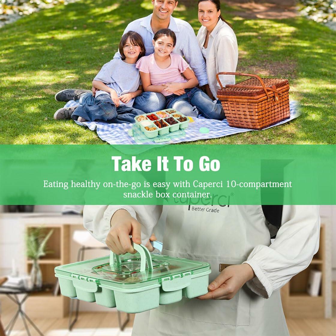 Caperci Snackle Box Large 10-Compartment Tray with Lid Handle Green