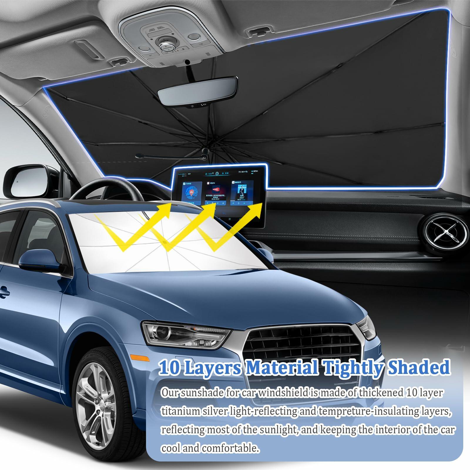 - EASY TO USE: The one-touch opening and closing function makes the potential energy device more smooth, you just need to pull it gently, umbrella windshield sun shade can be opened quickly, saving time and effort, bringing convenient use experience