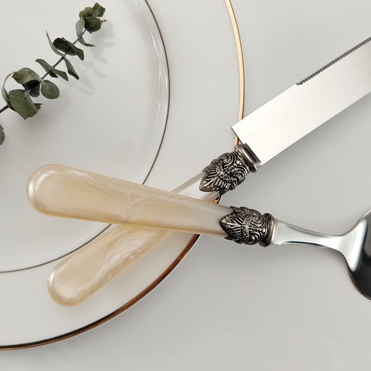 CATHYLIN cake knife and serve set is well-made and vintage designed. The most important feature of our luxury serve set is the unique acrylic pearl handle design. It is perfect combination of beauty and elegant.