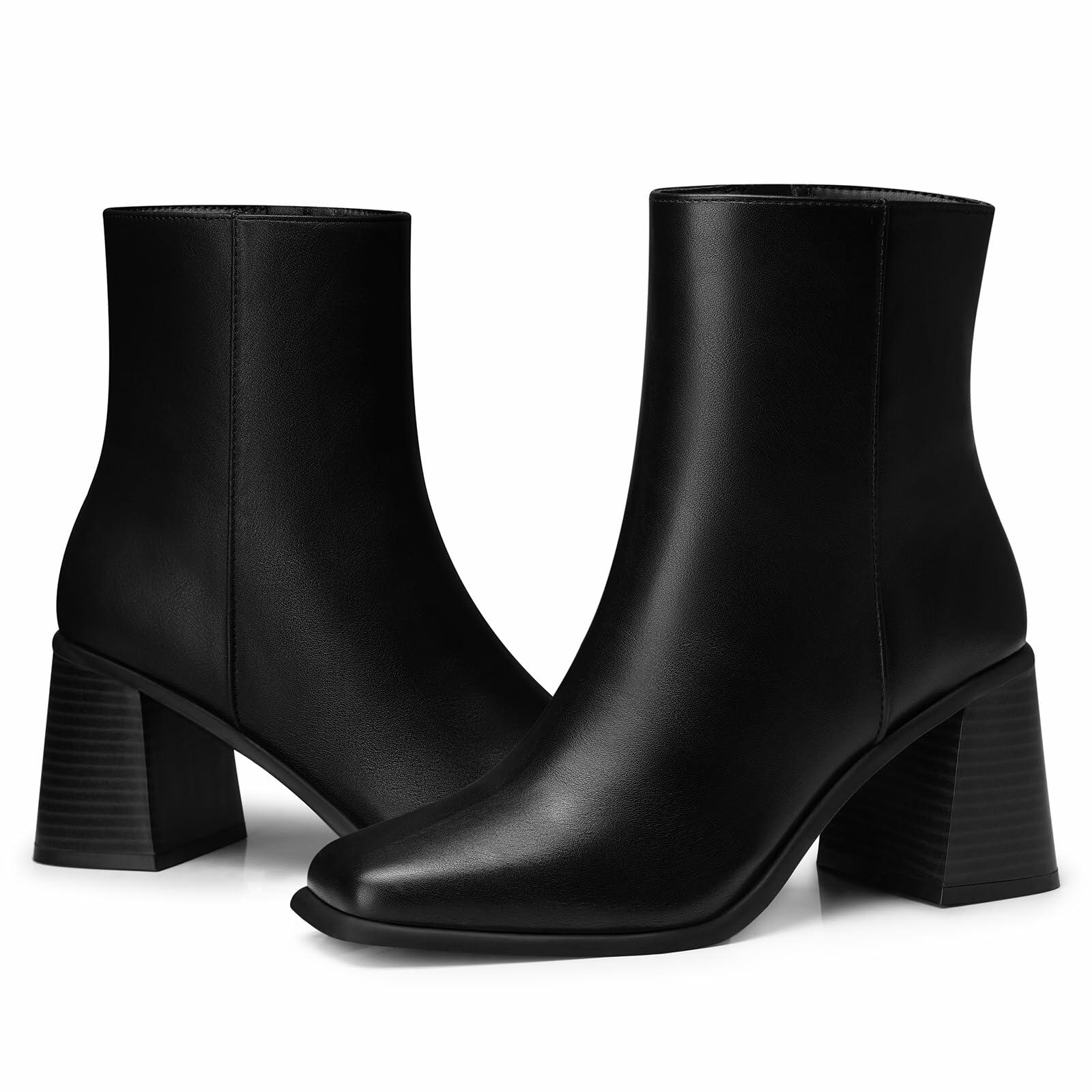 - SCULPTED SILHOUETTE: Elevate your style with these classic ankle booties. Crafted from elegant PU leather, clean lines and minimalist design feature sleek side zippers. The 2.91-inch chunky block heel creates a timeless, elegant profile