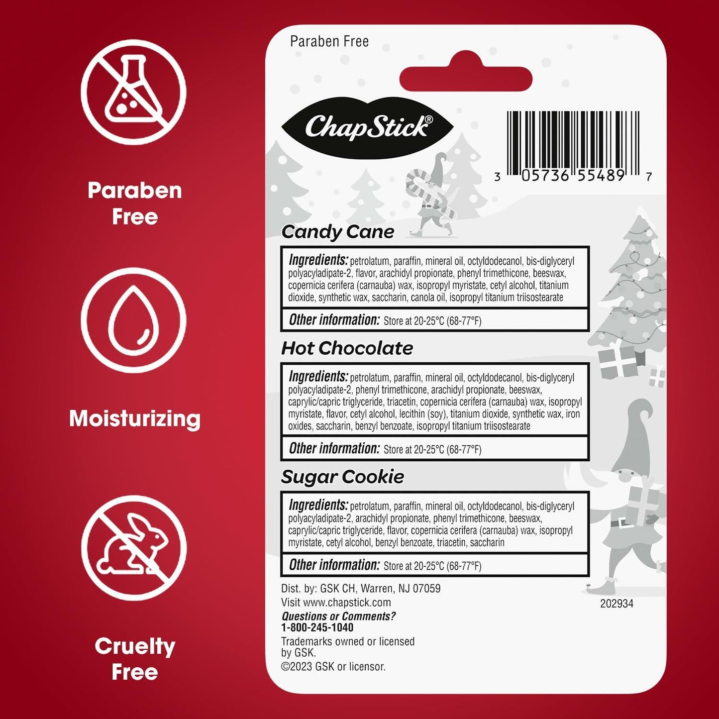 - CHAPSTICK FAN FAVORITE: Celebrate the holiday season all year with five flavored lip balms that combine function and fun: 2 Candy Cane, 1 Sugar Cookie, 1 Hot Chocolate, and 1 Vanilla Icing.