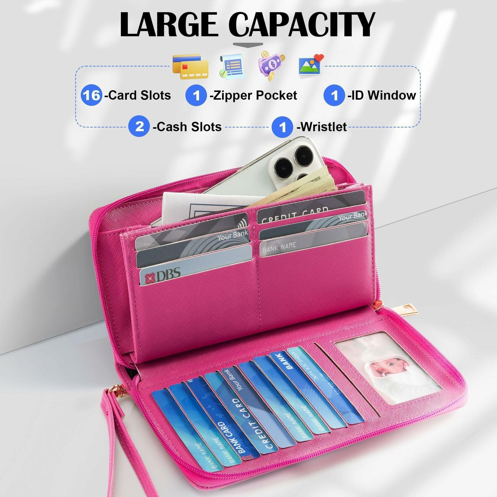 - Large Capacity Wallet: At 8.26"×4.5"×1", this RFID women's wallet has 1 ID slot, 16 card slots, 1 coin slot, and 2 long slots to hold cash, cards, and even your cell phone