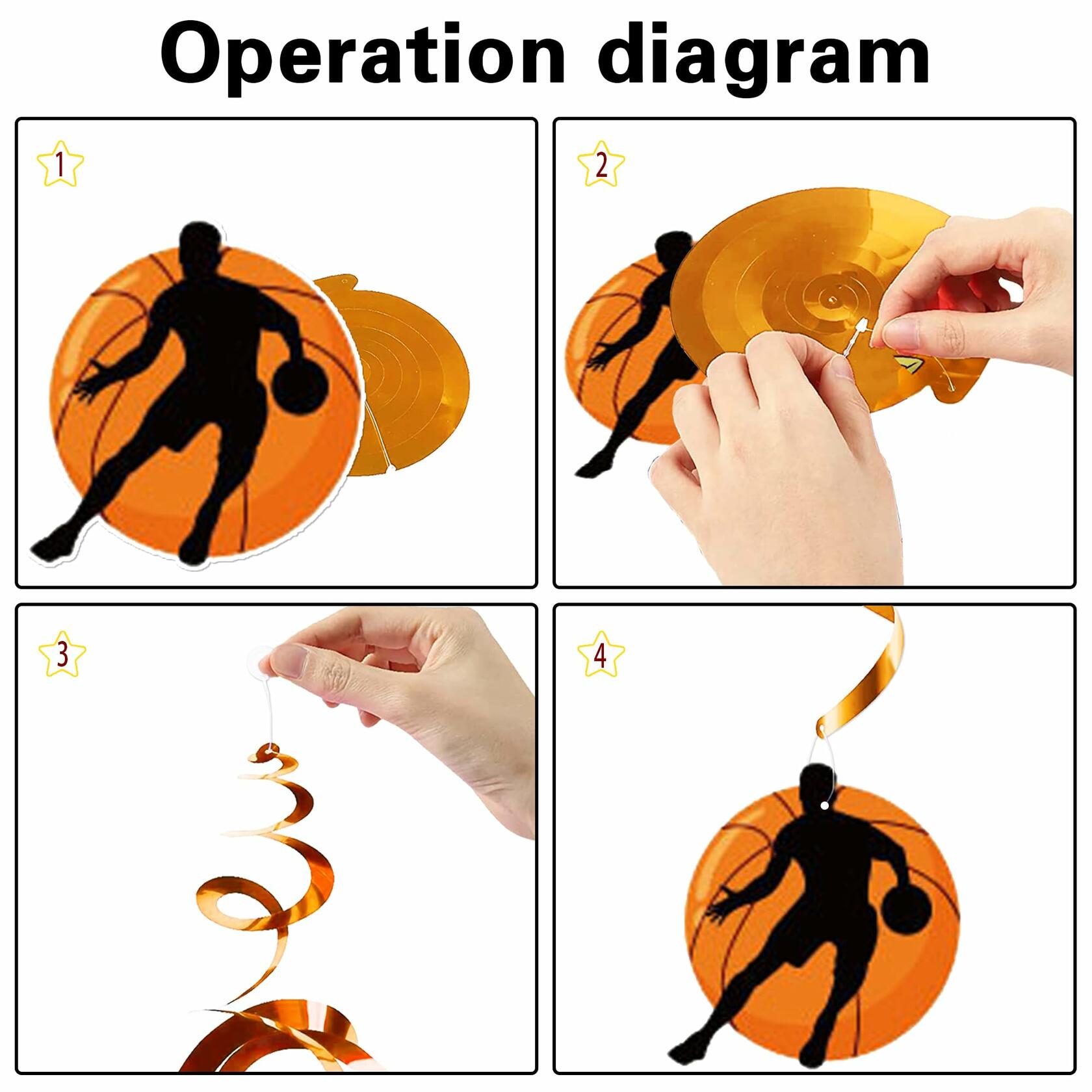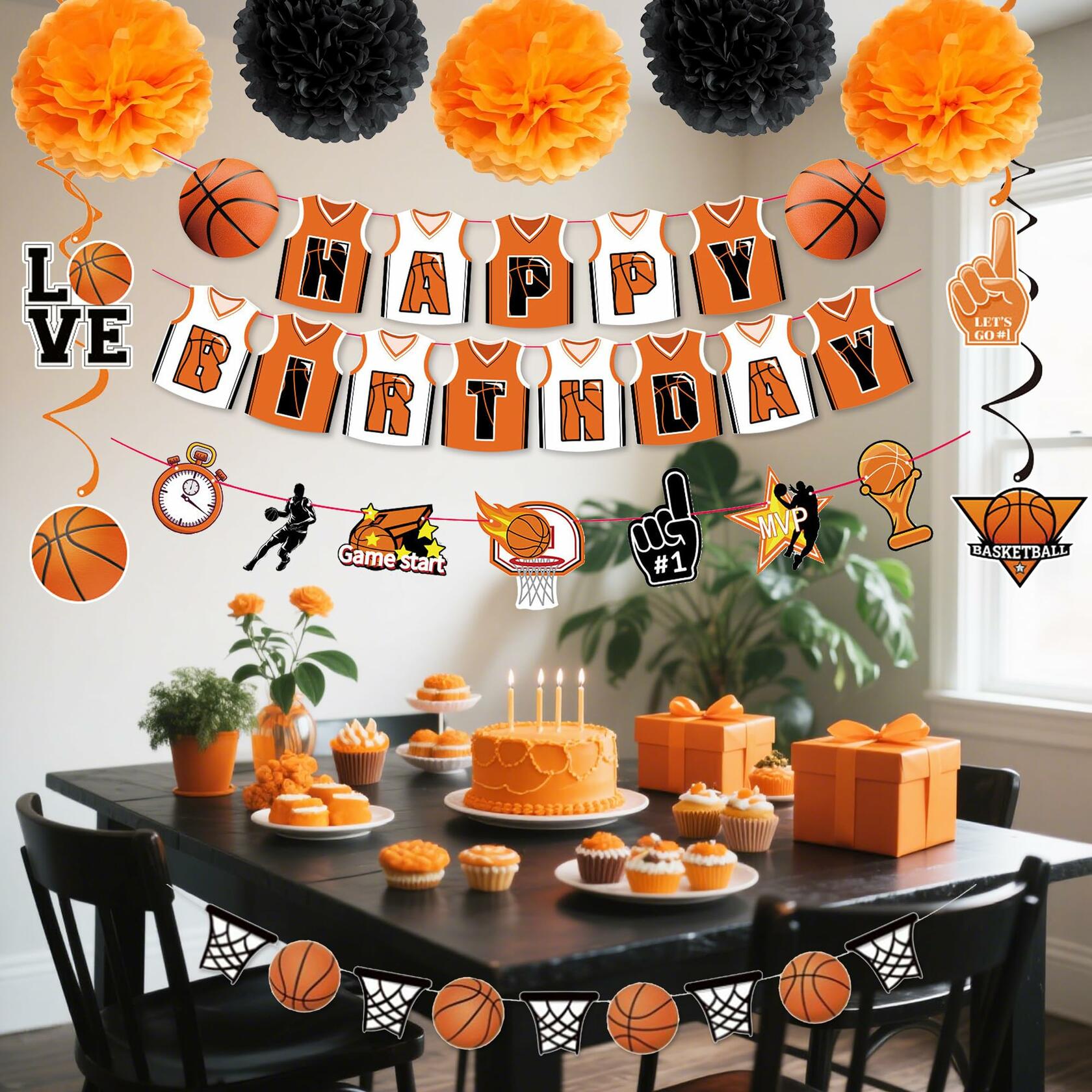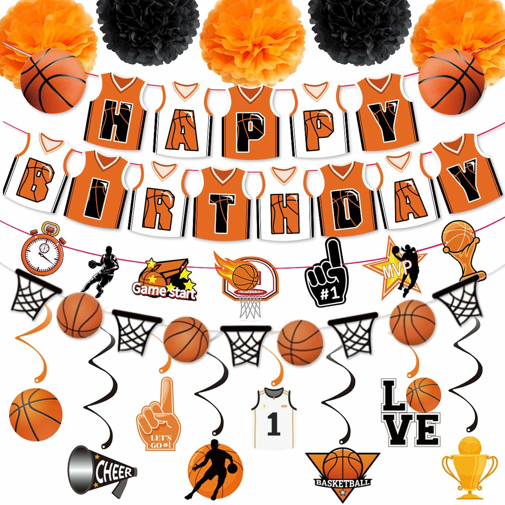 - Basketball Party Decorations: Includes 1 basketball birthday banner, 2 themed garlands, 8 hanging swirls, and 5 tissue paper pom poms. These basketball birthday decorations offer a full kit for decorating your basketball theme party space
